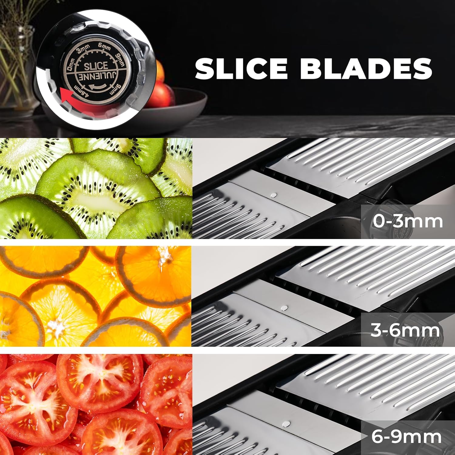 - Adjustable Mandoline Slicer: We designed three kinds of thickness slicing blades-3mm, 6mm and 9mm; two julienne settings-4.5mm and 9mm. With built-in rotating adjustable blade, if need to adjust thickness or change cutting options, just adjust knob, no need to touch the blade.