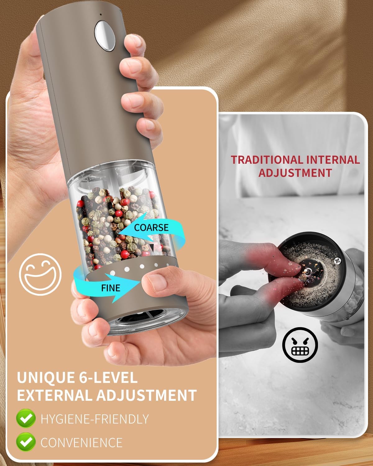 - ✔️ADJUSTABLE COARSENESS - This automatic salt and pepper grinder can meet your grinding needs. Easily adjust the core to achieve the perfect coarseness for grinding salt, pepper, or any other seasoning of your choice. The pepper grinder set is made of a high-quality ceramic grinding core to help you retain the original flavor of the spices