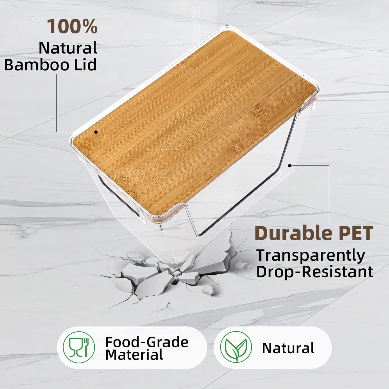 - CLEAR PLASTIC CONSTRUCTION - The storage bins are made from safe PET material, ensuring they are both aesthetically pleasing and durable. Their high transparency allows for easy visibility of the contents inside, making it unnecessary to label items for quick identification. These clear pantry baskets with 100% natural bamboo lids, adding a touch of elegance to your pantry organization.