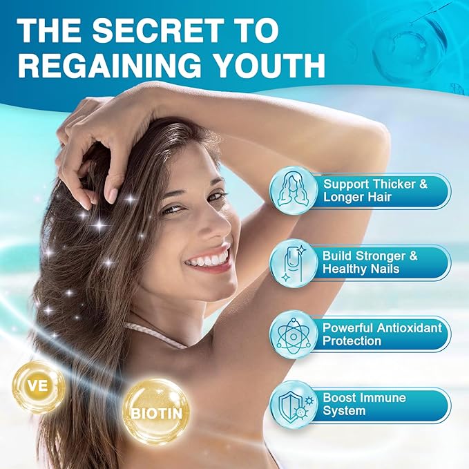 • UNLOCK RADIANT SKIN: Our multi collagen peptides with vitamins C & E provide powerful antioxidant protection & promote natural collagen synthesis, boost immune system. Hyaluronic acid works togeter to improve skin elasticity & hydration, smooth fine lines & wrinkles. Plus, biotin strengthens hair follicles & boosts keratin production, supports healthy hair & nail regrowth. Nourish yourself from the inside out & restore your natural glow!