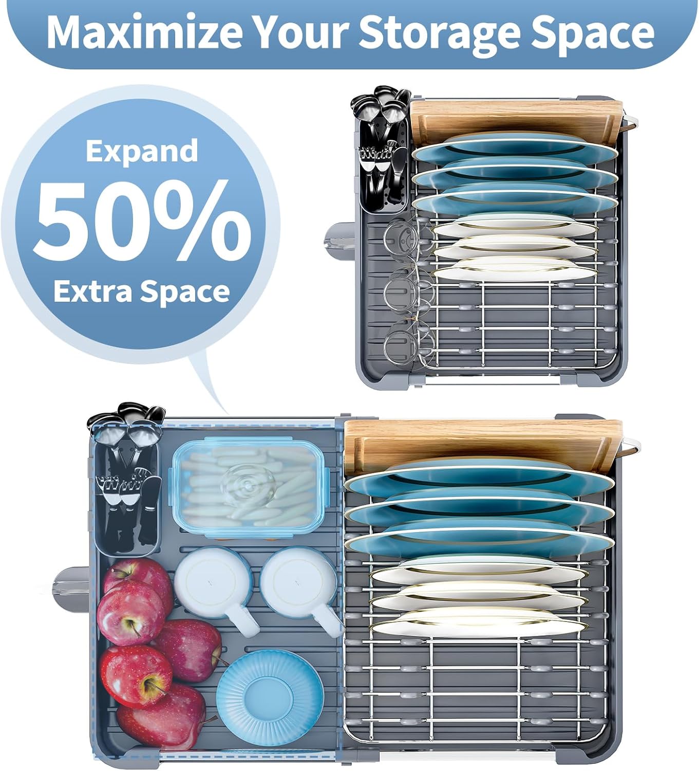 Stainless Steel Dish Drying Rack - Dish Drainer for Kitchen Counter, Extendable Drainboard with Foldable, Space-Saving Cup & Bowl Organizer, Includes Knife and Utensil Holder, Gray