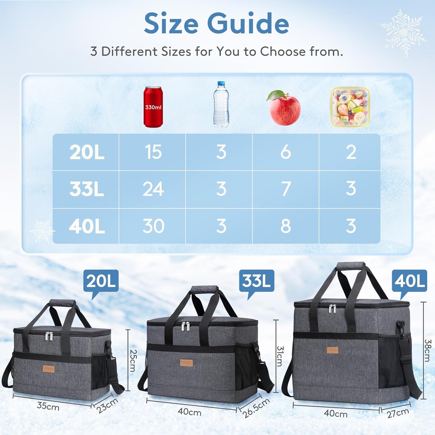 - Measurements: The cooler bag can hold up to 40 Liters (10.5 gallons) by volume; The overall dimensions of the lunch bag are 15.7"(40cm) Γ 10.6"(26.5cm) Γ 14.9"(38cm)