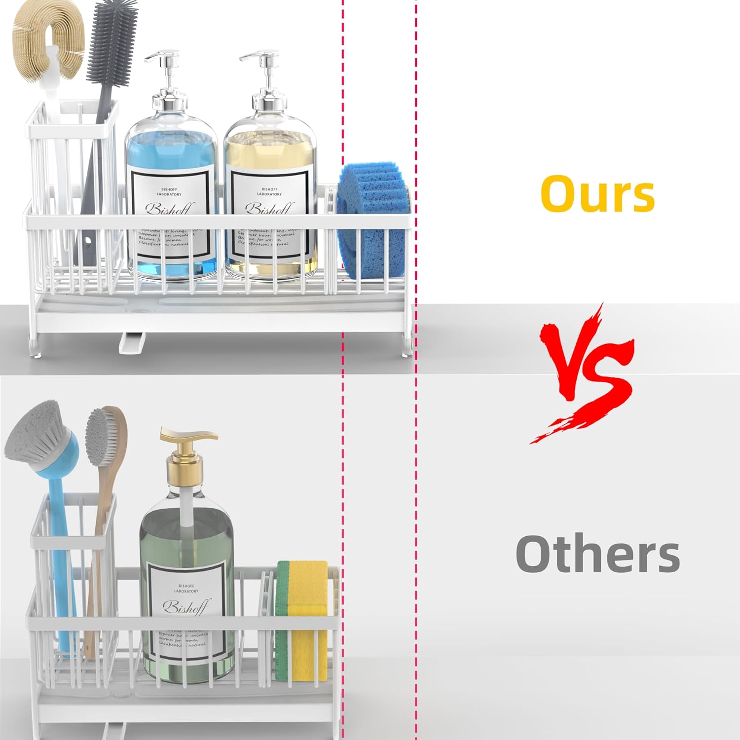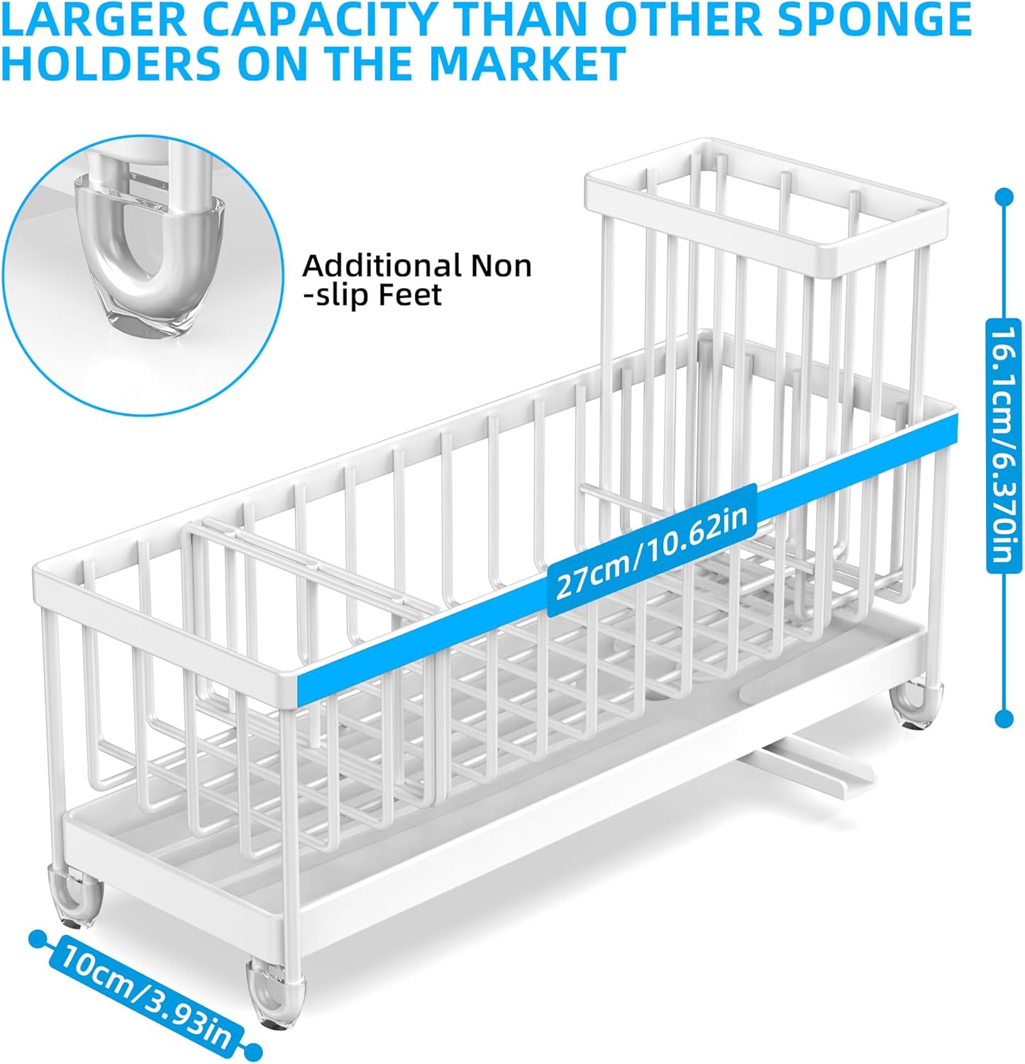 - 【LENGTH UPGRADE LONGER VERSION】Moforoco Lengthen sponge holder has increased the length by 1.37 inches compared to the regular 9.25-inch length on the market, and the total length is 10.62 inches. It means you can accommodate 2 * soap dispenser bottles, 4* brushes, and a sponge, making your storage space easier, accommodating more of your items and saying goodbye to clutter.