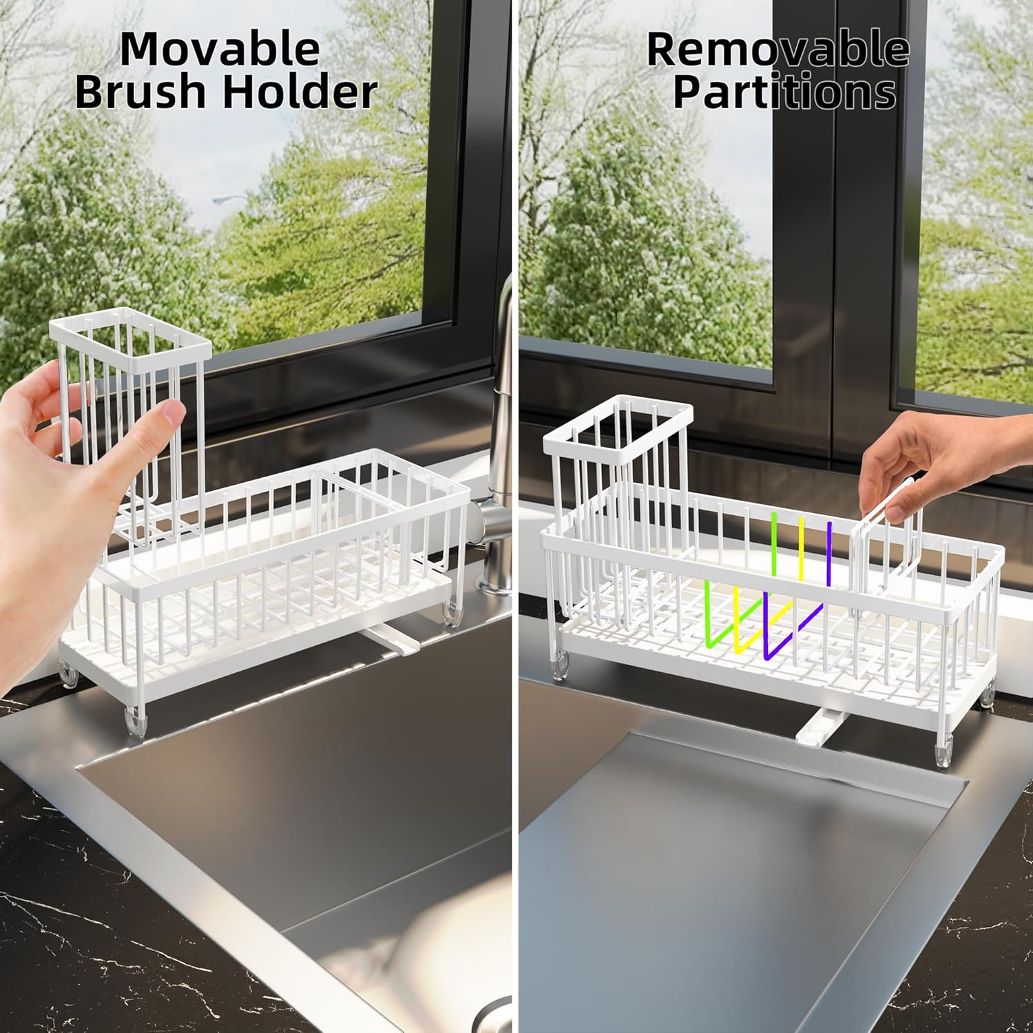 - 【BRUSH STORAGE RACK】The higher brush storage rack allows your brushes to be better stored without falling. The kitchen sink caddy can be used after receiving it, no installation is required, and it is widely used on sink countertops or bathrooms. It is a satisfying gift.