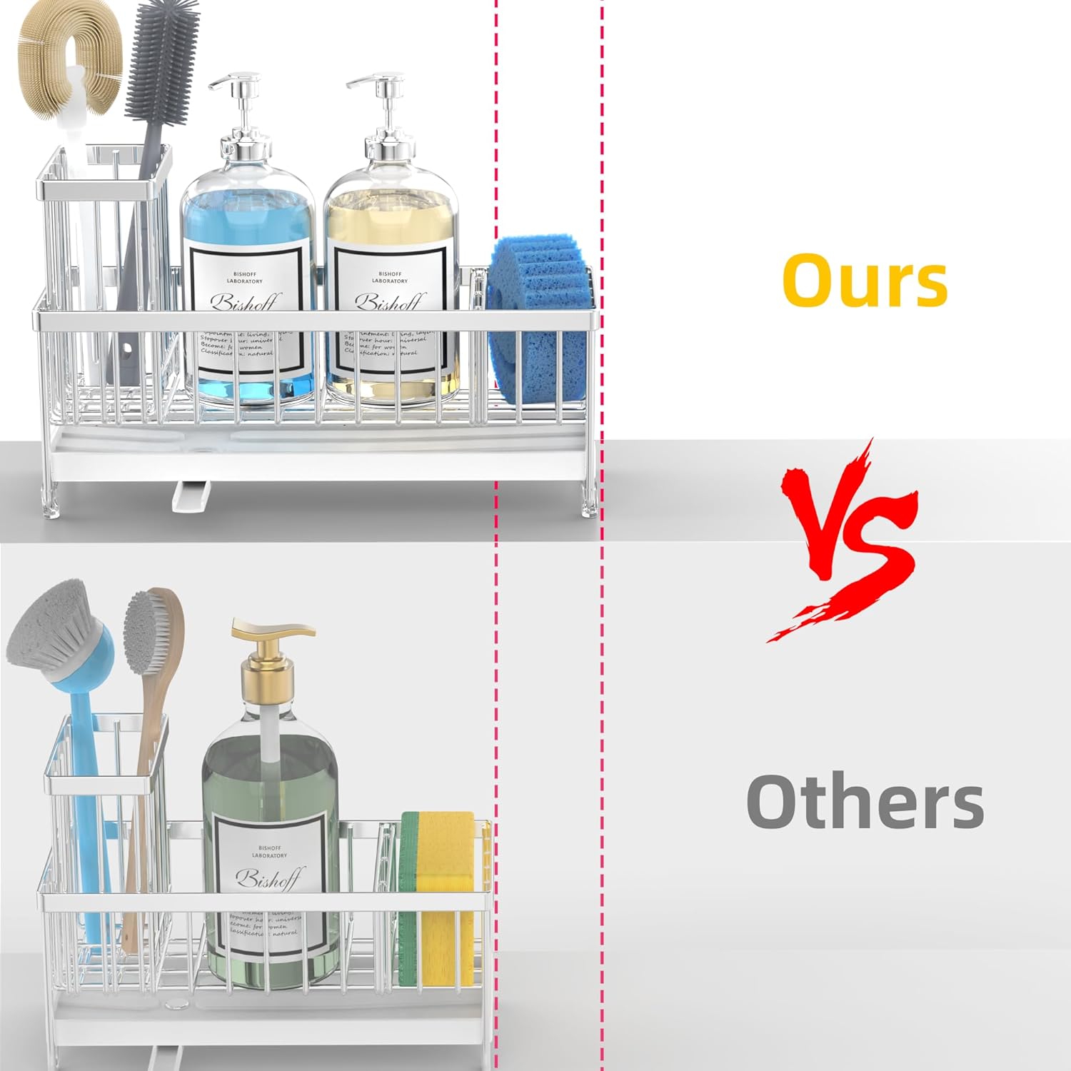 - 【LENGTH UPGRADE LONGER VERSION】Moforoco Lengthen sponge holder has increased the length by 1.37 inches compared to the regular 9.25-inch length on the market, and the total length is 10.62 inches. It means you can accommodate 2 * soap dispenser bottles, 4* brushes, and a sponge, making your storage space easier, accommodating more of your items and saying goodbye to clutter.