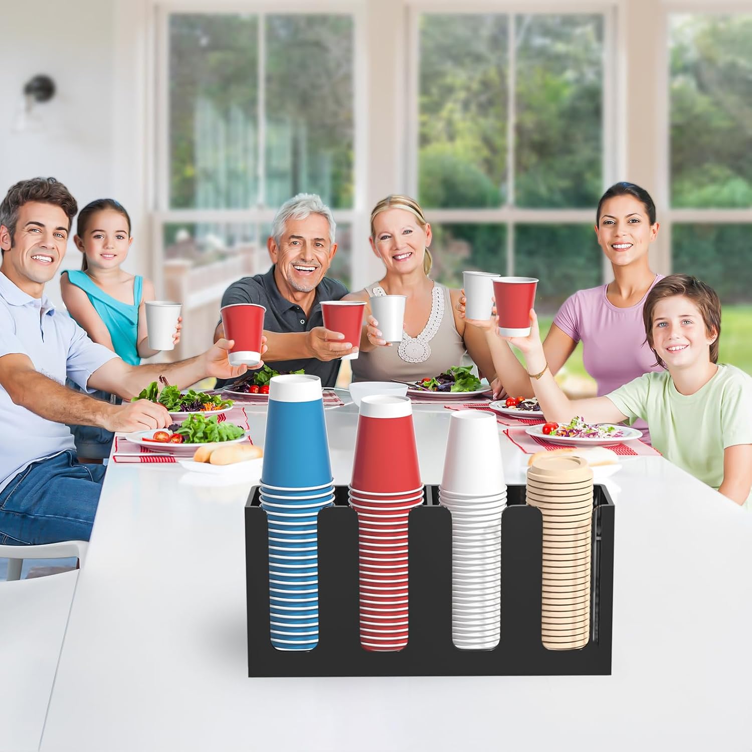 WINFFOR Disposable Cup Organizer Dispenser - 4 Compartments Black Acrylic Cup and Lid Holder with Handles Plastic Cup Dispenser Countertop Paper Cup Holder for Coffee Bar House Party Essentials