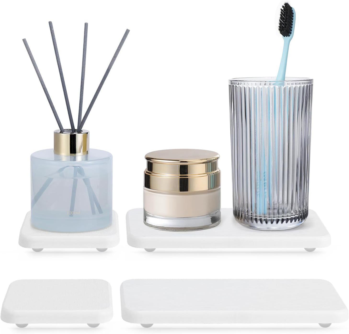 Water Absorbing Stone Tray for Sink | Quick Drying Diatomaceous Earth Coasters | Soap Dish Holder & Toothbrush Holder for Bathroom Counter | Hand Soap & Plant & Toiletries | White 4-Pack