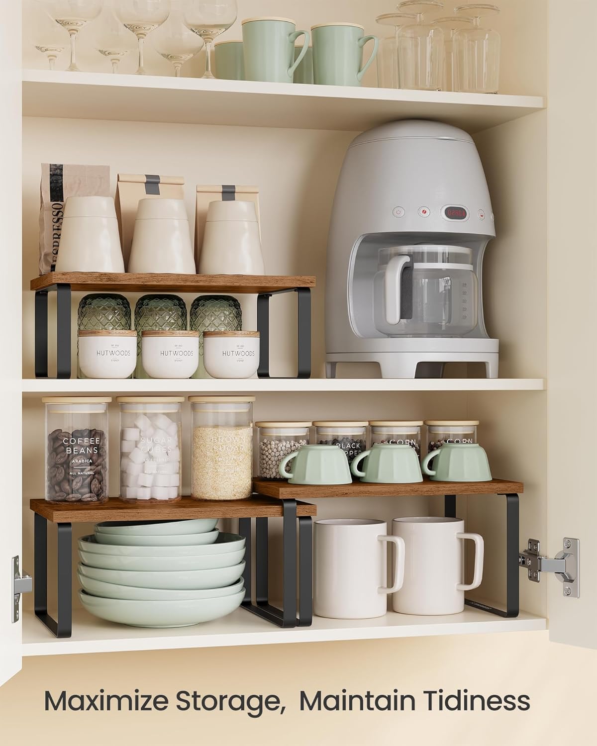 - 【STURDY AND DURABLE】Crafted from premium engineered wood and metal, these shelf organizers offer a robust construction. With a max. load capacity of 11 lb per spice rack, your kitchen essentials are securely stored