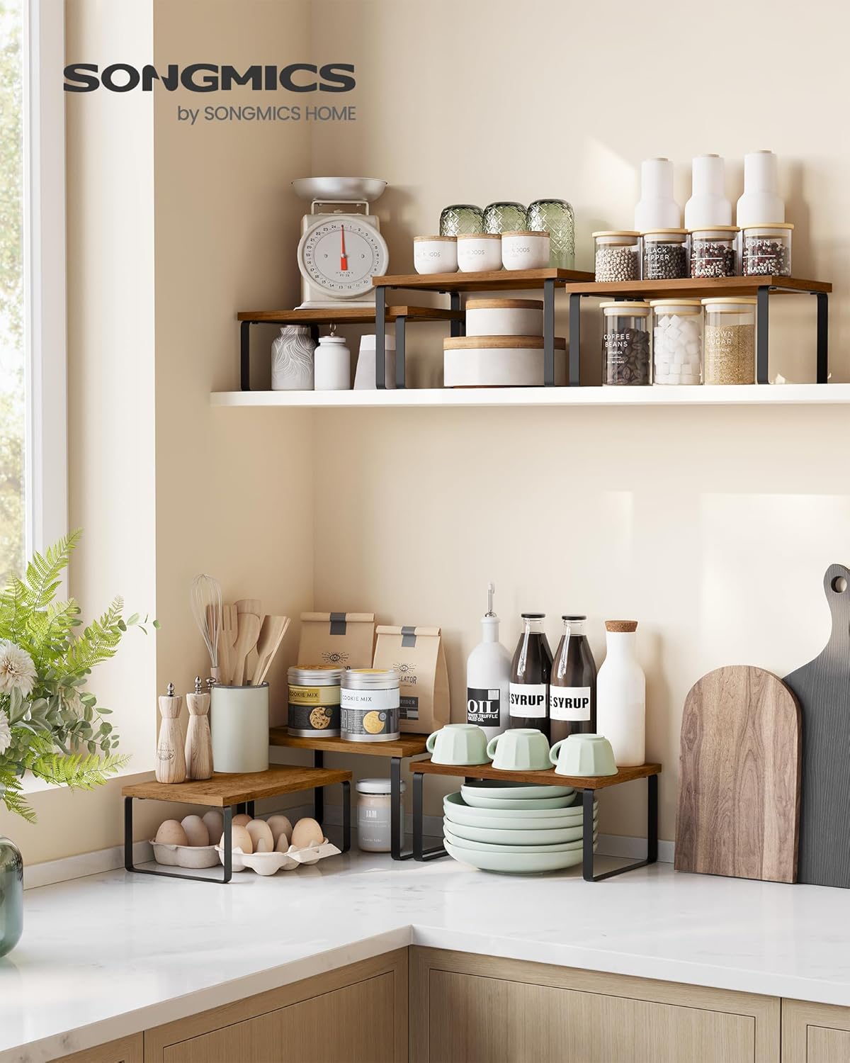 - 【MULTIPURPOSE USE】Not just for the kitchen! Use these kitchen counter shelves to elevate your dining table centerpiece in the restaurant, organize makeup on your bedroom desk, or store toiletries in the bathroom