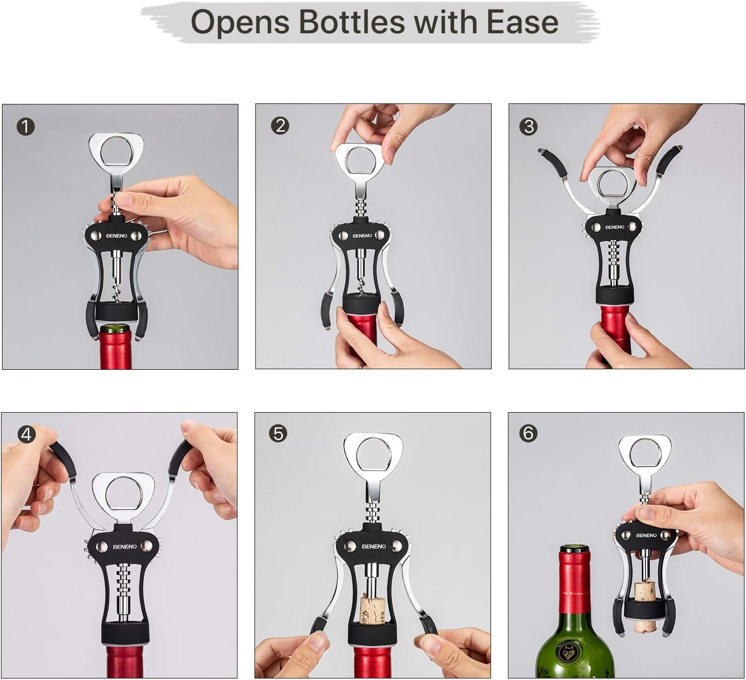 Beneno Wine Opener with Stainless Steel Wine Foil Cutter - Bottle Top Seal Cutter, Zinc Alloy Premium Wing Corkscrew with Multifunctional Bottles Opener, Upgrade Black Set