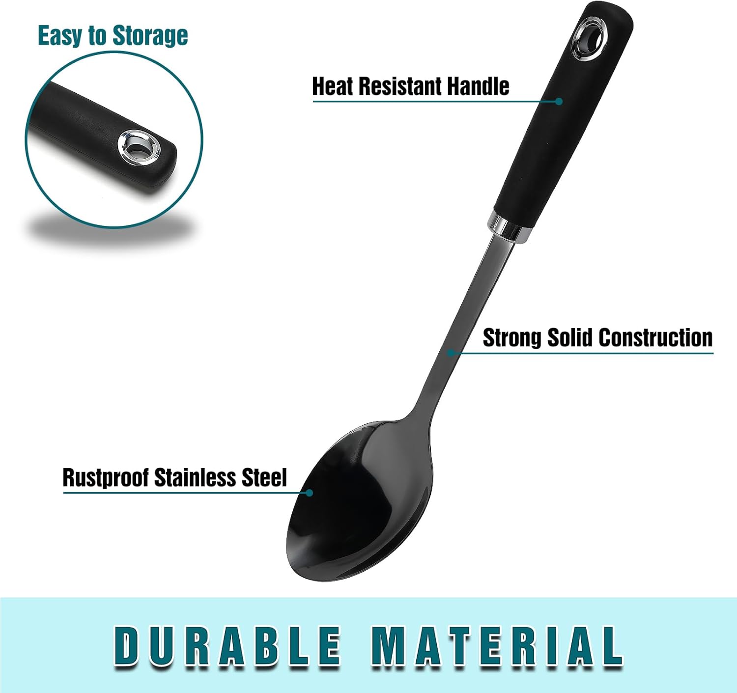 Stainless Steel Cooking Spoon Heavy Duty Basting Spoon Serving Spoons Stainless Steel Cooking Utensils with Non-Slip Ergonomic Handle, Black