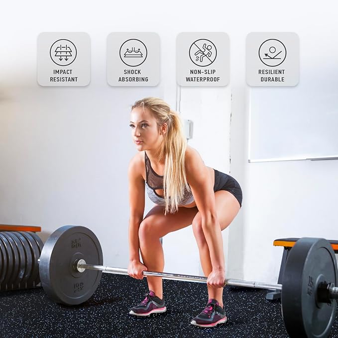 • [Sturdy Rubber Build]: Crafted from premium recycled rubber, our gym mats handle intense workouts with ease. These resilient tiles effortlessly support heavy machinery, providing reliable floor protection against scratches, scuffs, and dents from weights, dumbbells, medicine balls, jump ropes, and other workout gear in a home gym.