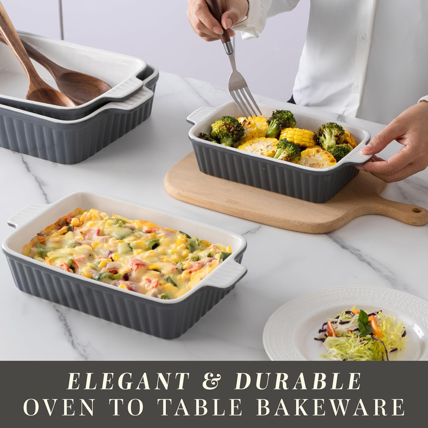 - Oven to Table - These ceramic casserole dishes will provide you with a beautiful dish to cook and serve in.