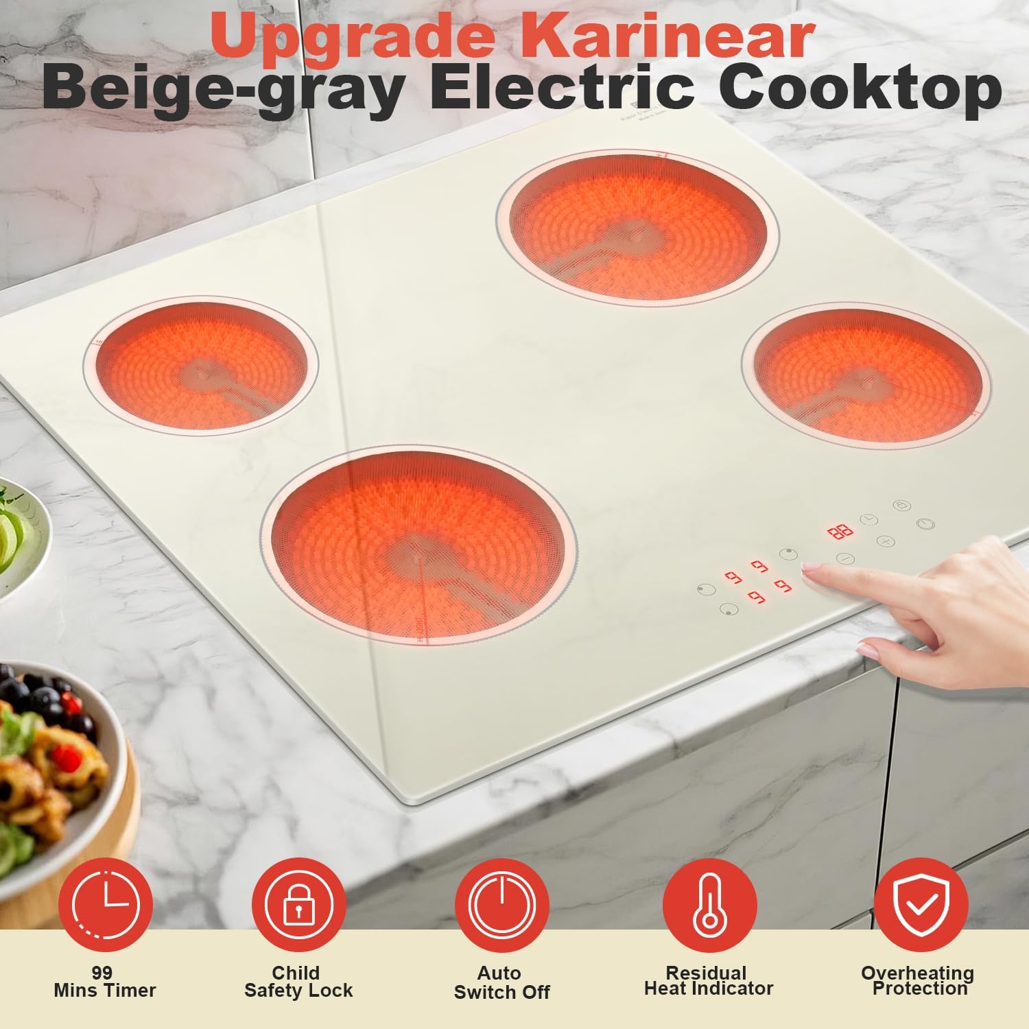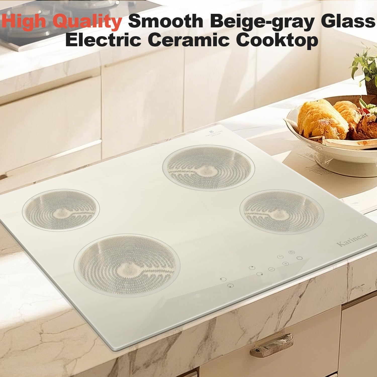 Karinear Electric Cooktop 24 Inch, Beige-gray Glass Electri Cermaic Stove, 4 Burners Electric Stove Top with Timer, Child Safety Lock, High Temperature Alert, 6000W, Drop-in 240V Hardwire(No plug)