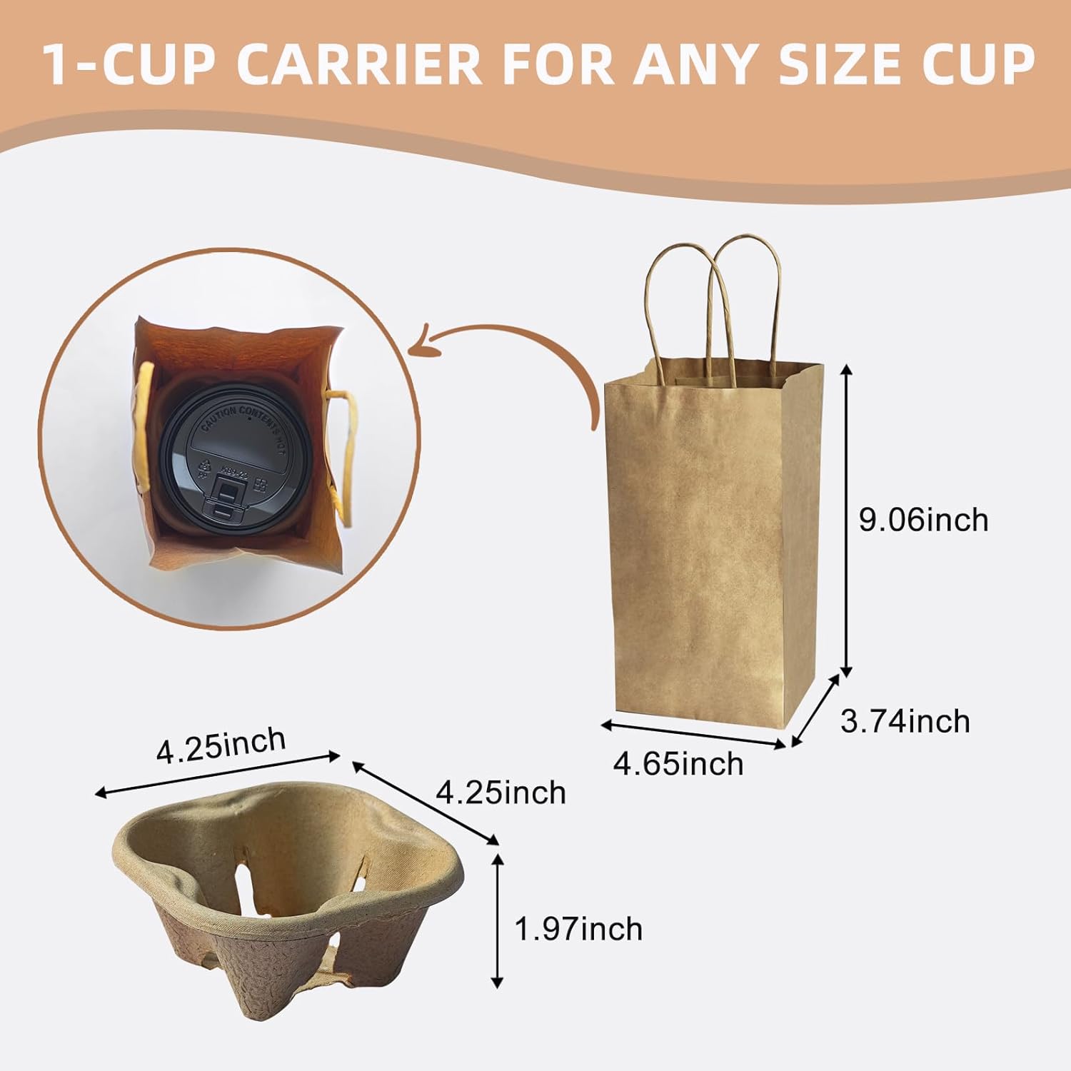 Take-Out Paper Bags And One Drink Paper Trays 100 Pack One Cup Carrier Tray Coffee Cup Holder Disposable Cup Holder Tray,Brown Baper Bags With Handles Bulk (One-cup size)