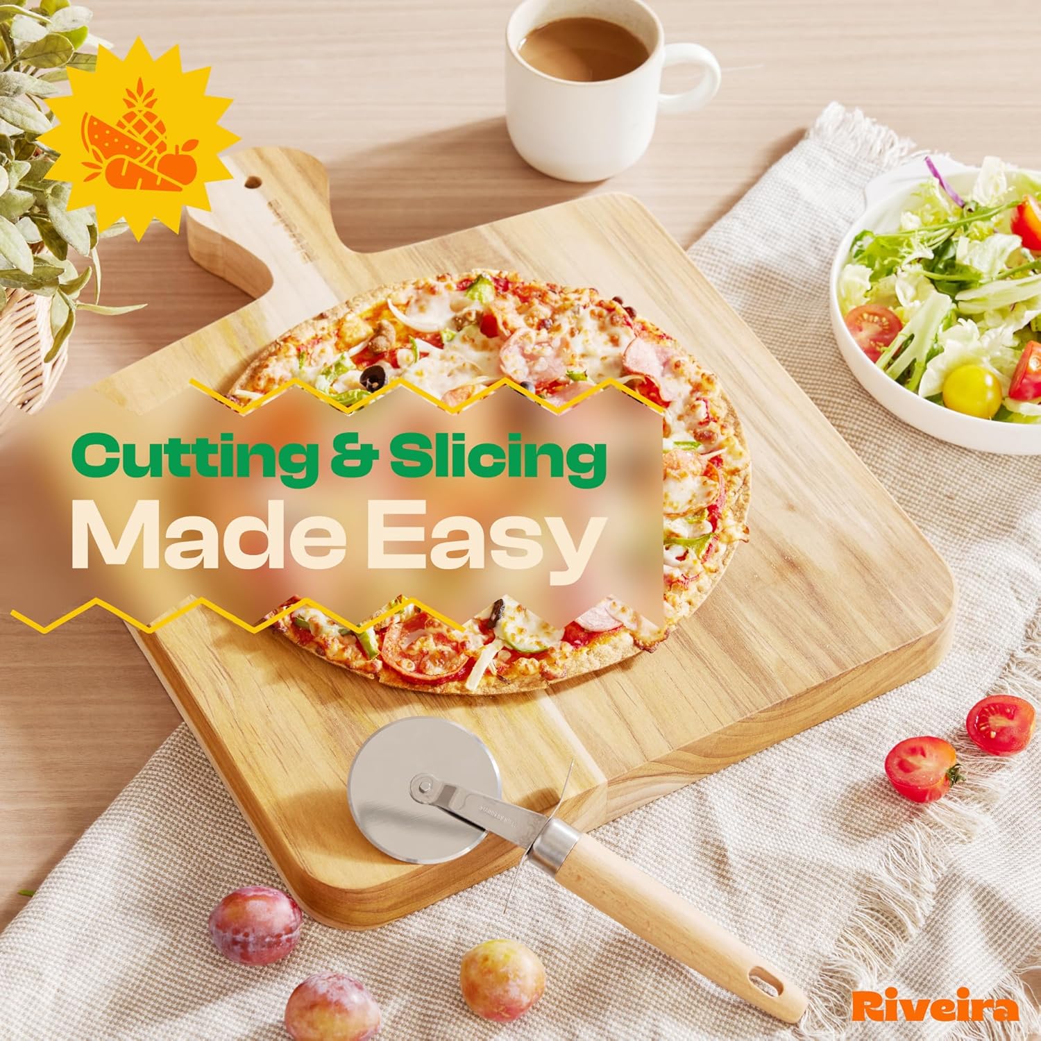 - Premium Crafted Teak — Take a detour from traditional kitchen aesthetics with this teak wood board crafted from 100% natural teak. Beyond being an unconventional and eco-friendly choice, the chopping board wood proudly showcases the environment friendly and organic teak. This wood cutting boards for kitchen counter adds an unexpected touch of confidence and style to your once-orderly culinary space. Riviera's wooden chopping boards for kitchen will be there for you for many years to come.