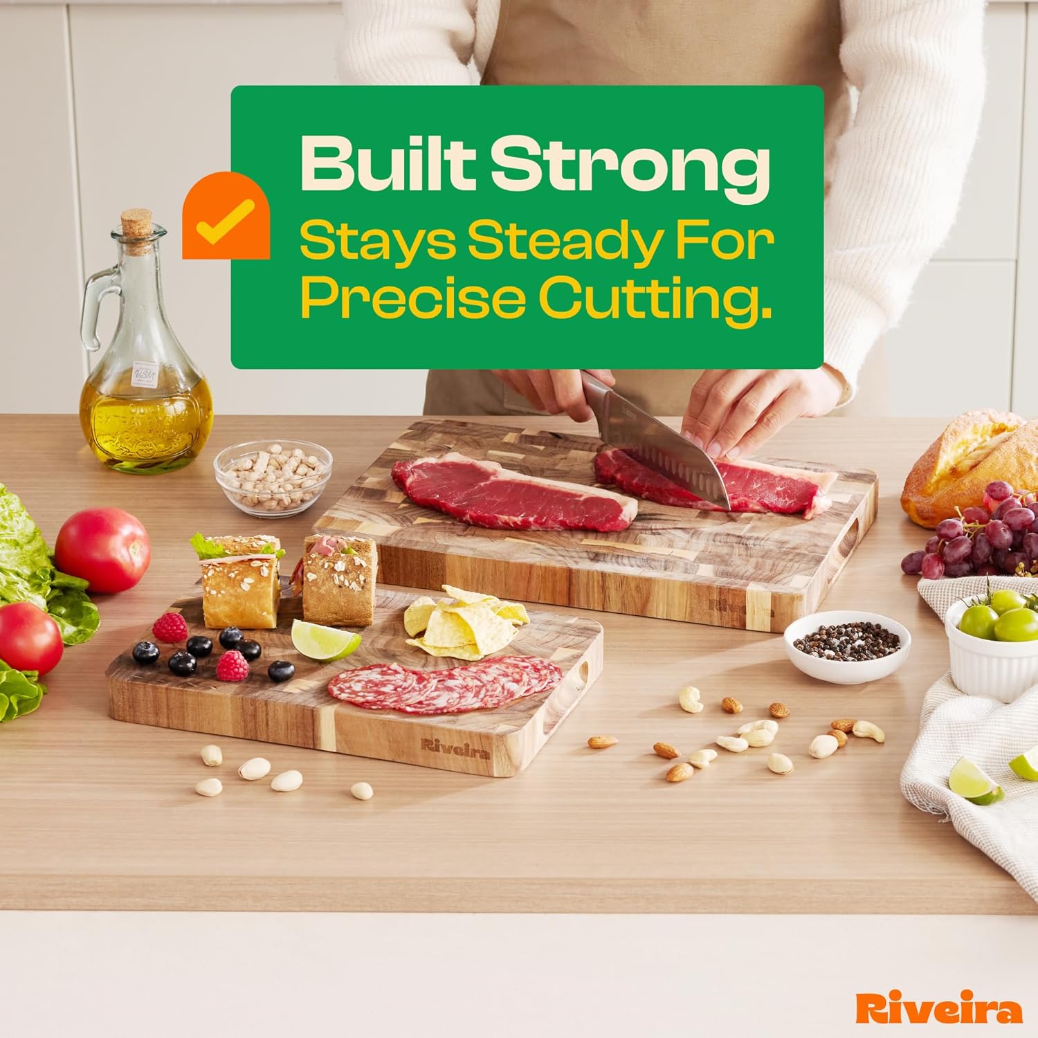 - No Mess Cutting and Transfer — Enjoy a mess-free kitchen with our large wood cutting board. Equipped with deep juice grooves, these chopping block catch liquid runoff from meat, fruit, and other ingredients, preventing spills and countertop messes. Whether you're working in an industrial restaurant kitchen or your home, this real wood cutting board makes cleanup a breeze. Transfer ingredients from your prep station to the stove without any fuss with Riveira acacia cutting boards.