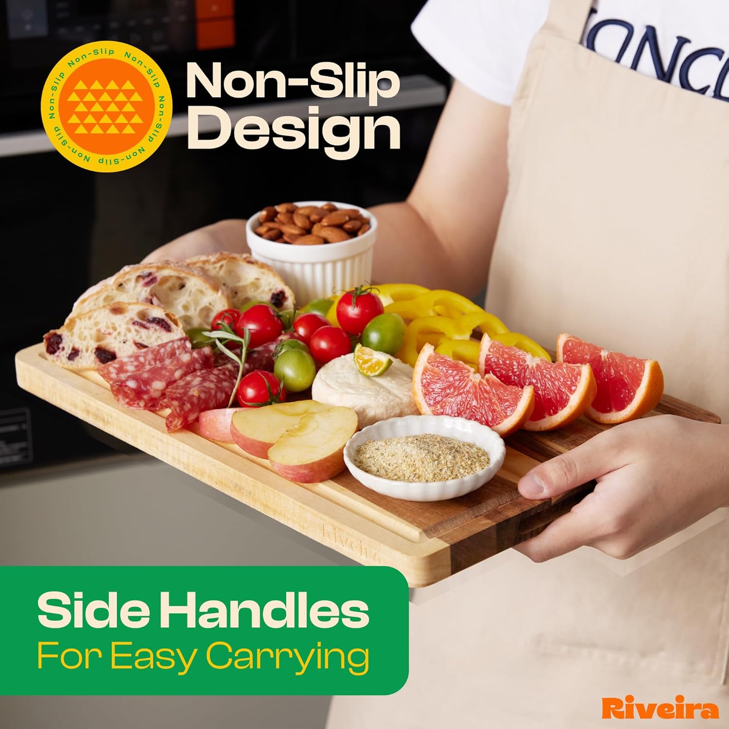 - Handle Everything with Confidence — The built-in handle holds of the acacia decorative cutting board are designed for handling everything with confidence and easy maneuvering. Pre-oiled and ready for immediate bewilderment, this large charcuterie boards is not just convenient for the kitchen mess but has a unique design to maintain, ensuring a performance that is both comfortable and clean for wooden boards for kitchen. Riviera acacia wood cutting boards will be perfect in your kitchen.
