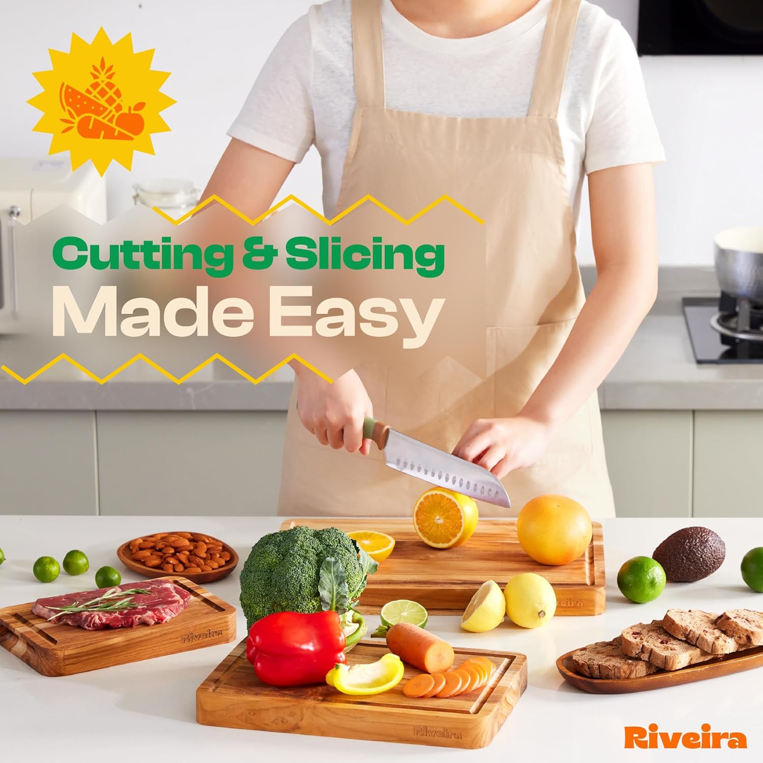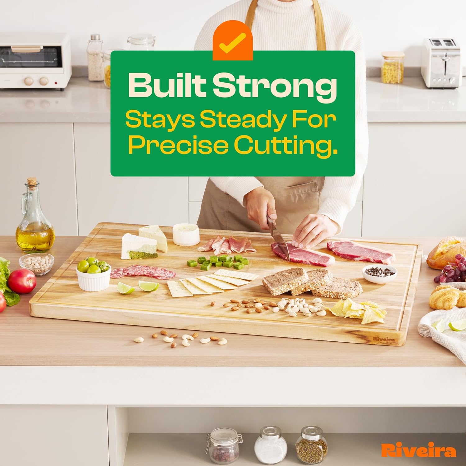 - Premium Crafted Teak — Take a detour from traditional kitchen aesthetics with this teak wood board crafted from 100% natural teak. Beyond being an unconventional and eco-friendly choice, the chopping board wood proudly showcases the environment friendly and organic teak. This wood cutting boards for kitchen counter adds an unexpected touch of confidence and style to your once-orderly culinary space. Riviera's wooden chopping boards for kitchen will be there for you for many years to come.