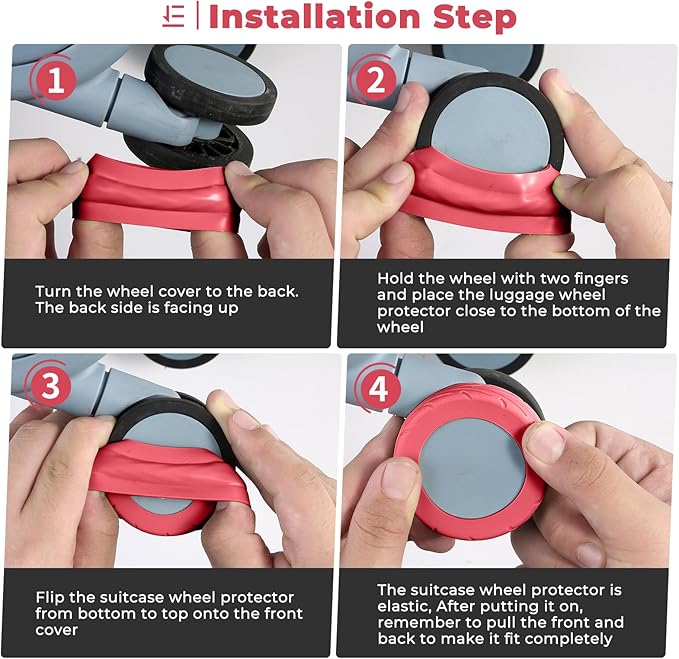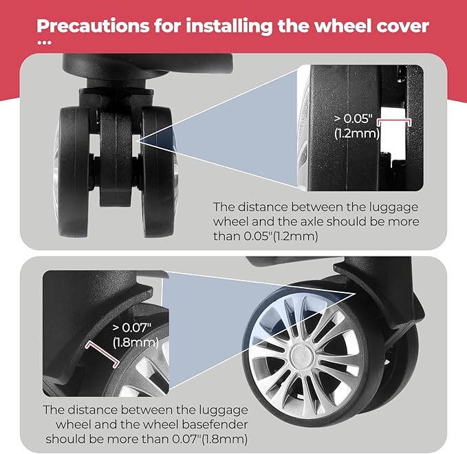 • [Fits Most Suitcases] These suitcase covers for luggage wheel are suitable for suitcases with wheel diameter between 2.0-2.4"(50-60mm),the distance between the luggage wheel and wheel base fender should be more than 0.07"(1.8mm),and the distance between the luggage wheel and axle should be more than 0.05"(1.2mm) ,This Suitcase wheel cover for luggage Suitable for 4x2 double wheels, not suitable for 4x1 single wheels luggage