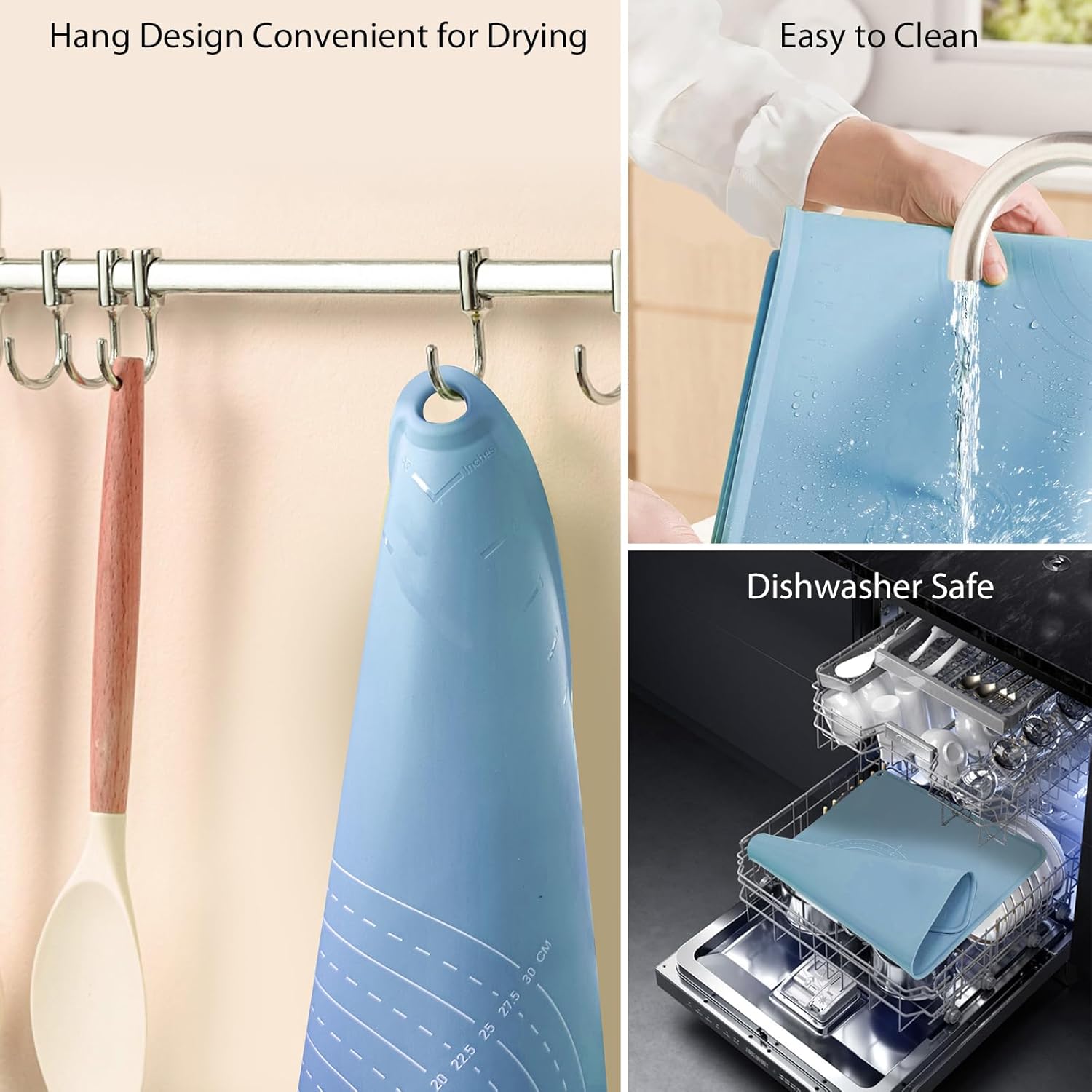 - Easy to Clean and Store: The smooth surface of the baking mat makes it easy to clean, just rinse the mat with warm soapy water or throw it into the dishwasher, there's no need to scrub again. Every package has a petal silicone tie wrap, it can be rolled up or folded for easy storage. In addition, the side holes can also be easily hung on the kitchen wall and then dry themselves