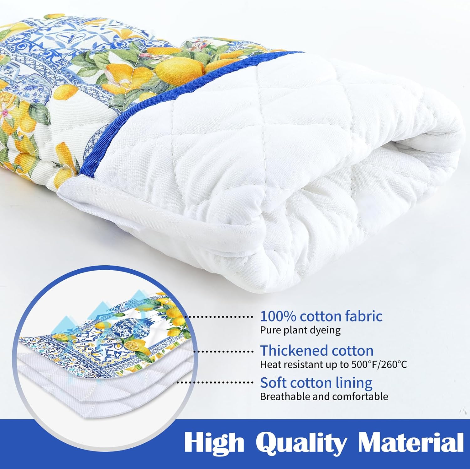 - PREFERRED MATERIAL: Each pot holders & oven mitts set is carefully crafted from 100% cotton, with dyes sourced from plants, digital printing technology and upgraded color fixing process, the colors are bright and fade-resistant. Cotton lining to bring you comfortable and breathable touch and protect your skin as well.