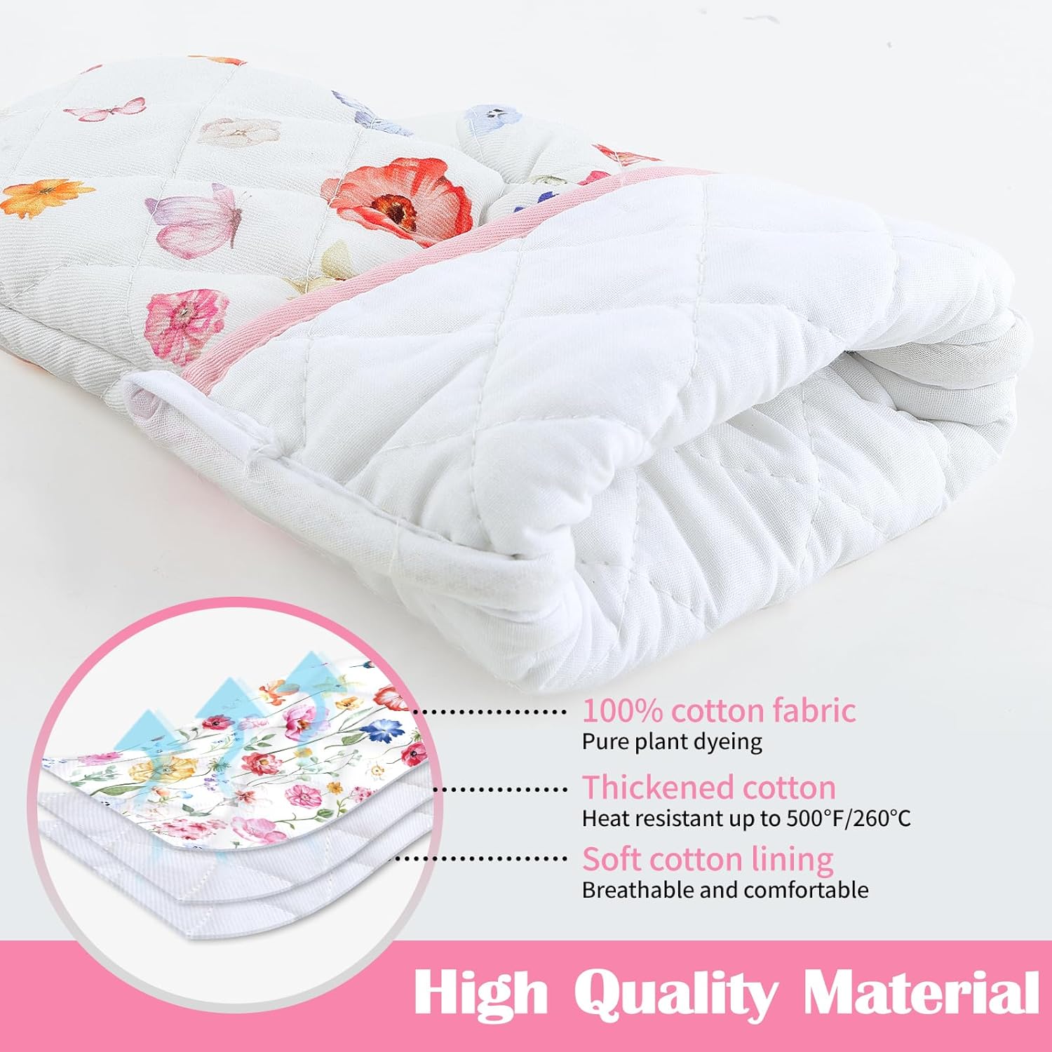 Wildflower Oven Mitts and Pot Holders Sets 4Pcs, 100% Cotton Heat Resistant, Extra Long Oven Gloves Potholder for Kitchen Cooking Baking Decoration
