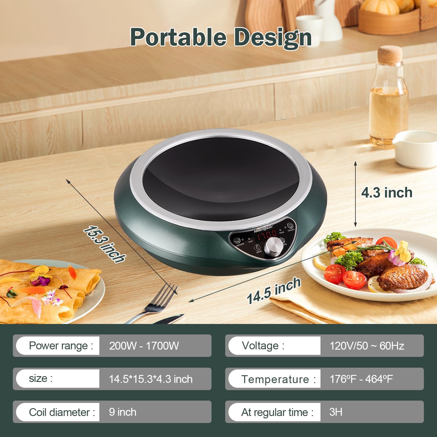 - [Wok Induction Cooker]: FCC certified, the Abangdun 110V-120V induction cooktop is suitable for all North American households and commercial applications. Its compact design makes it the perfect choice for outdoor cooking, meeting a wide range of culinary needs. The shallow concave surface design is based on the heating principle of induction hotplate, ensuring compatibility with round-bottom woks even if the curve isn’t a perfect match.
