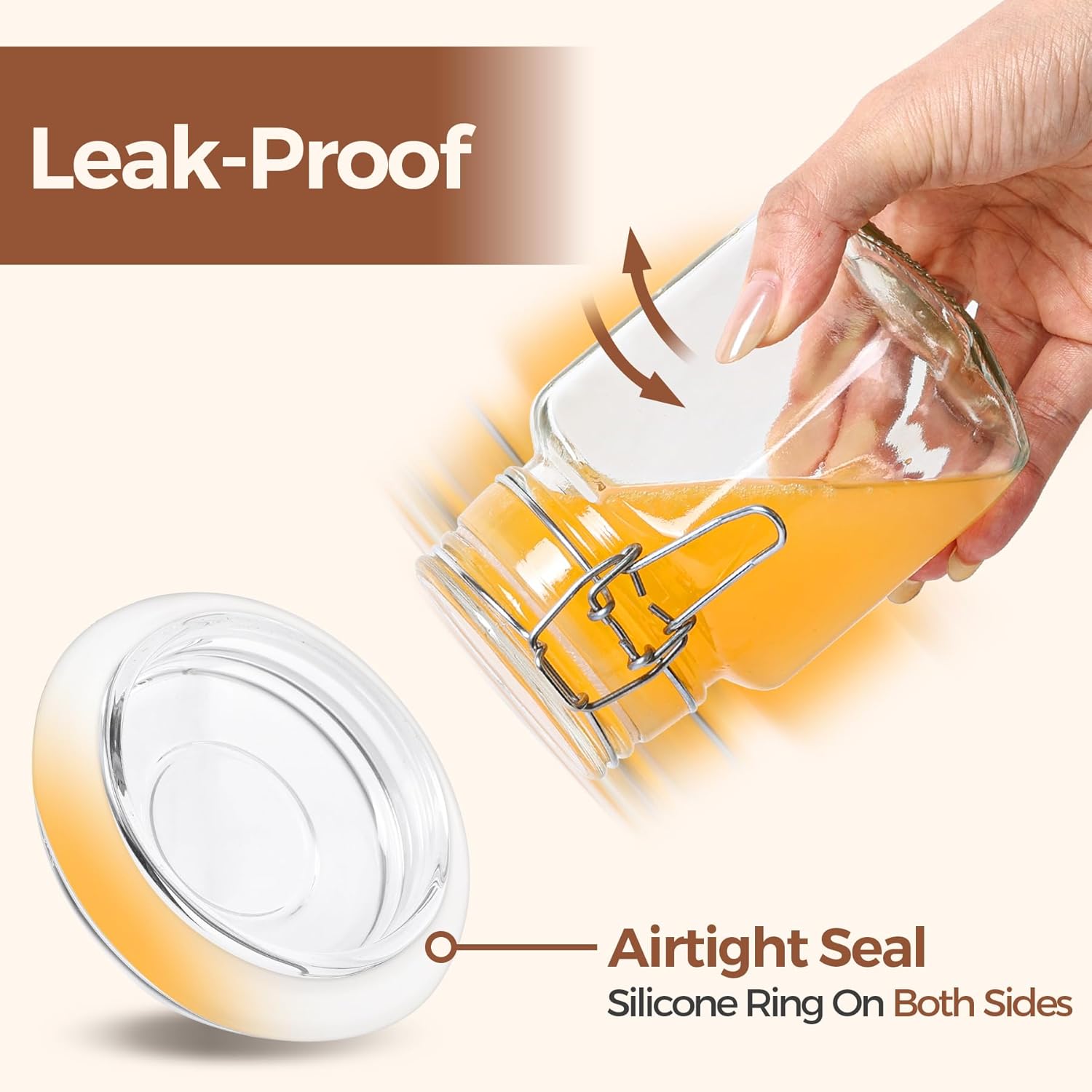 - Leak-Proof Small Jars: These food-grade 8oz glass jars with lids feature silicone gaskets and stainless steel clips for airtight sealing. Ideal for keeping food fresh for storing liquids like dressings, sauces, soups and jam