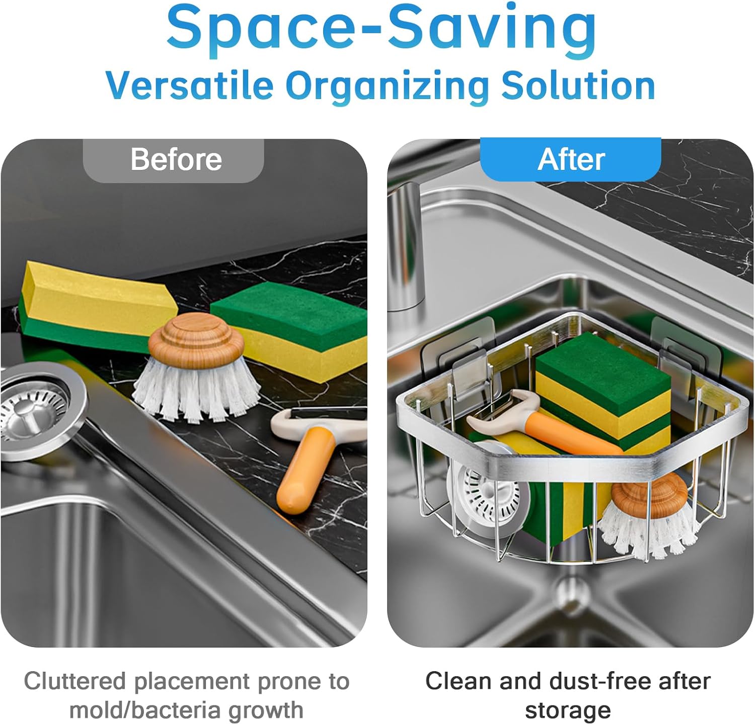 - đ§ăSpace-Saving Design for a Tidy KitchenăThe Sink Sponge Holder, sized at 4.7*4.7*3.5 inches, is intelligently designed to fit in the corner of your sink saving precious countertop space. This sleek and compact design not only keeps your kitchen tools within reach but also contributes to an overall neat and tidy kitchen environment.