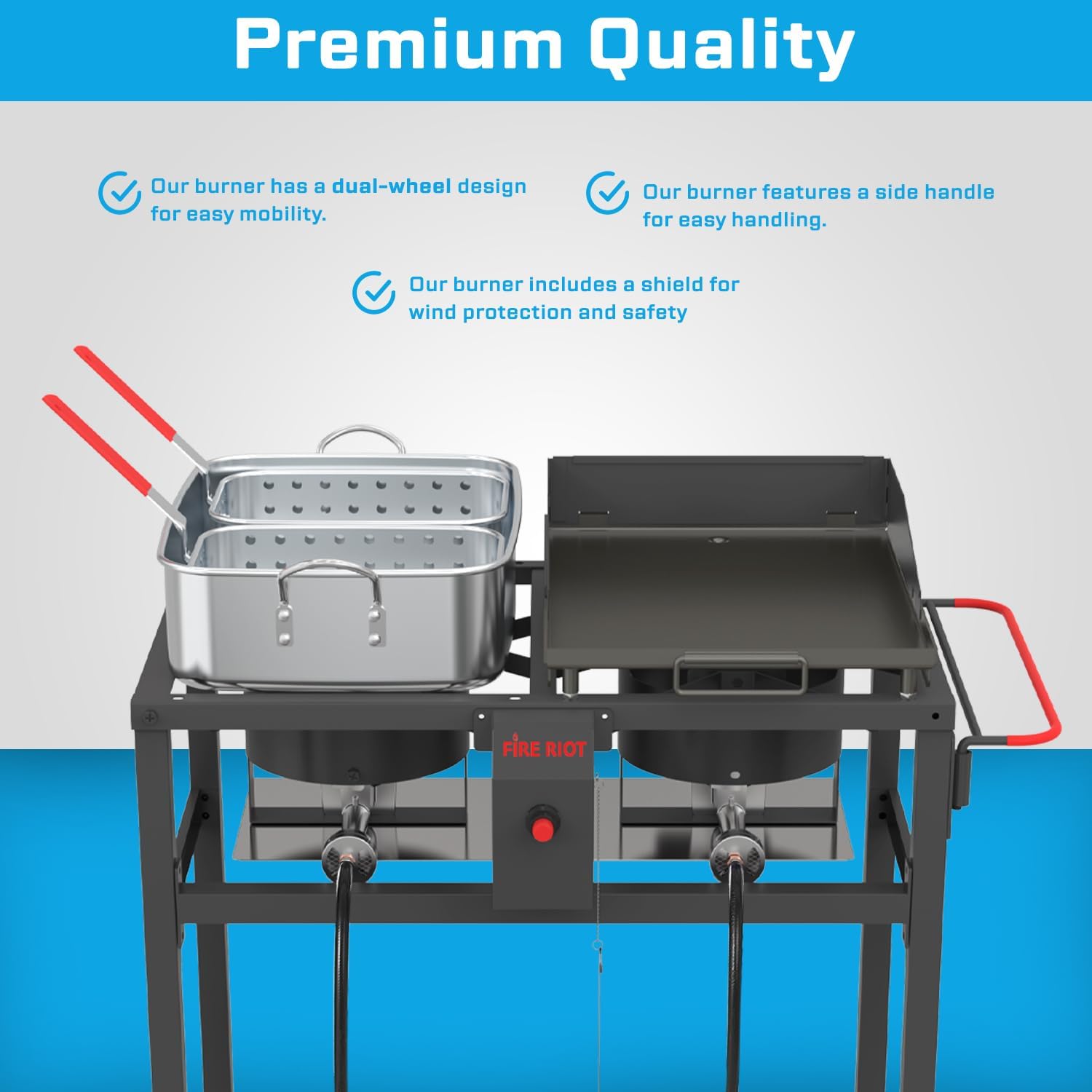 - PORTABLE & EASY TO MOVE: Designed with the on-the-go chef in mind, this outdoor wok burner features sturdy built-in wheels that allow for effortless transport, even across uneven terrain. Its lightweight yet durable construction means you can take it anywhere double propane burner β be it a campsite, a tailgate party, or a family reunion in the park. Enjoy the freedom to cook wherever your adventures take you, without compromising on convenience or quality.