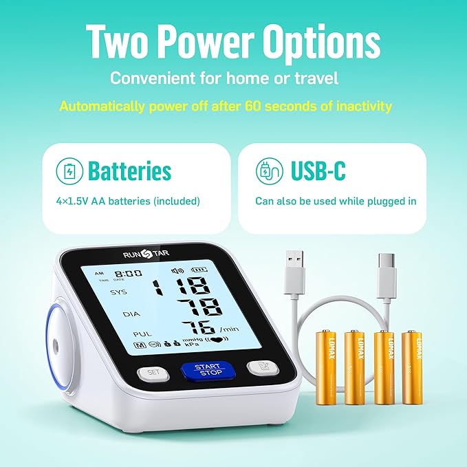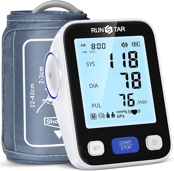 • [Large & Loud for Seniors] Runstar Upper Arm BP Monitor is user-friendly for seniors, featuring an ergonomically designed large 4.2" LCD display that is angled at 30° for easy viewing, along with soft backlighting and large fonts for clear readability. Additionally, it features voice broadcast (which can be turned off) to assist those with limited vision in accessing their health measurements