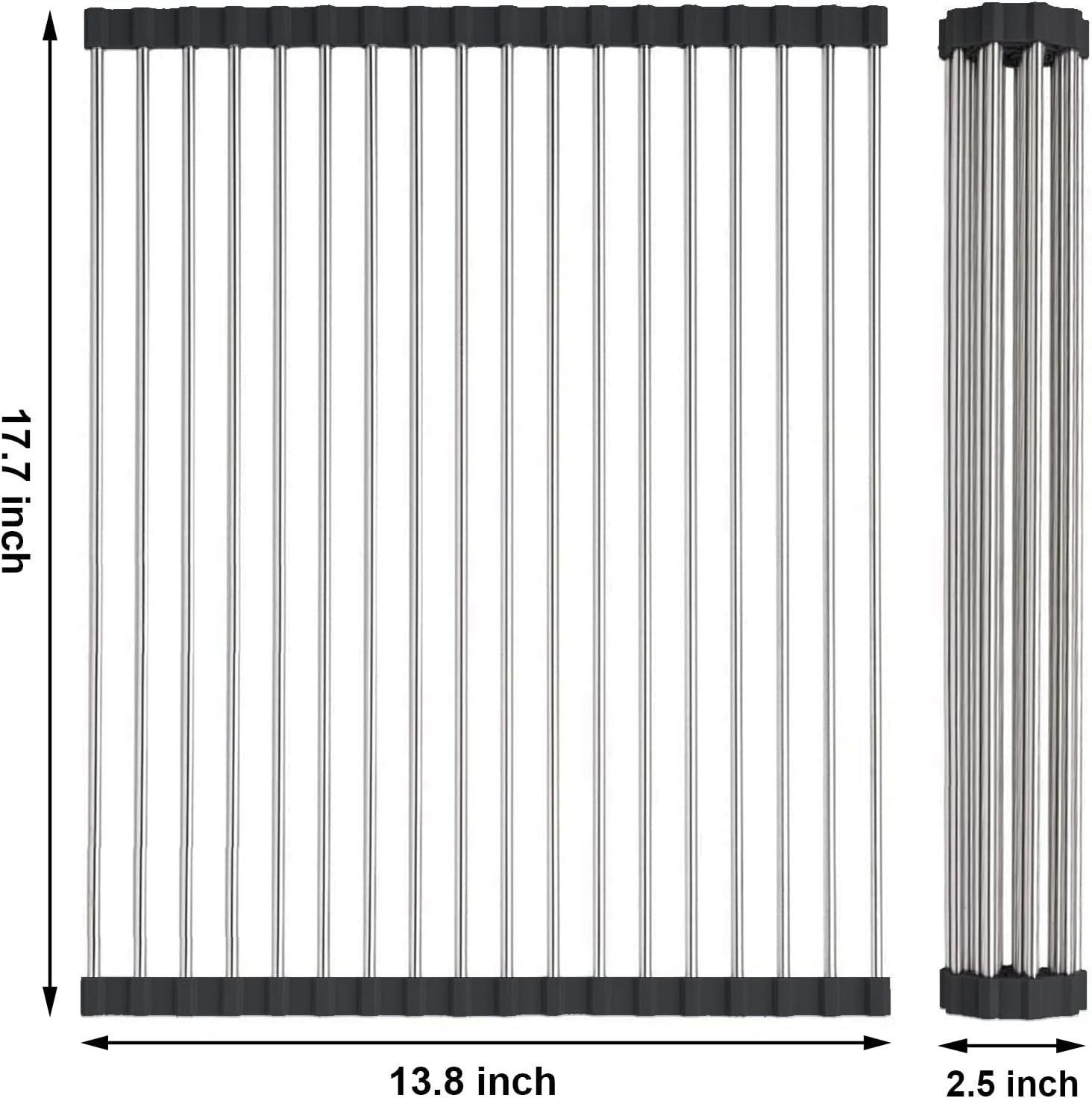 - Size : 17.7 x 13.8 inches, the size of the over sink dish drying rack is suitable for most kitchen sinks and countertop. And you can also fold or cut the collapsible sink drying rack according to your sink size for better use. Please kindly measure your sink size firstly before purchasing this roll up dish drying rack over sink. A great helper for home accessories and kitchen necessities. With this small kitchen gadget, your kitchen and home will be much tidier and comfortable