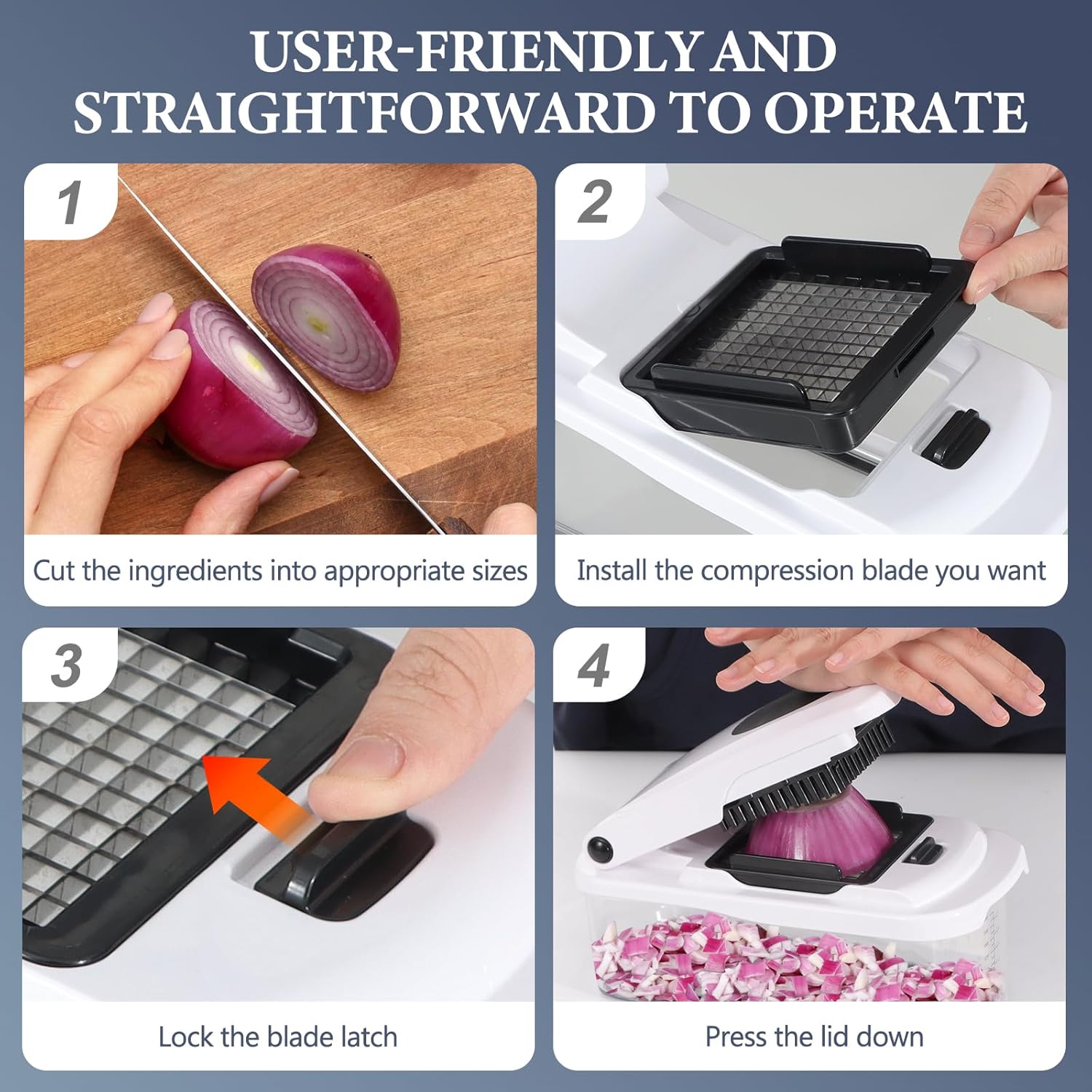 - An innovative vegetable chopper that will make you addicted to chopping: It is equipped with 2 interchangeable razor-sharp dicing blades for effortless ingredient preparation. A blade lock mechanism has been incorporated to ensure stability and precision during chopping. Additionally, the pusher features a easy removal for add convenience during cleaning. Furthermore, we have reinforced the food storage container to enhance overall safety and security