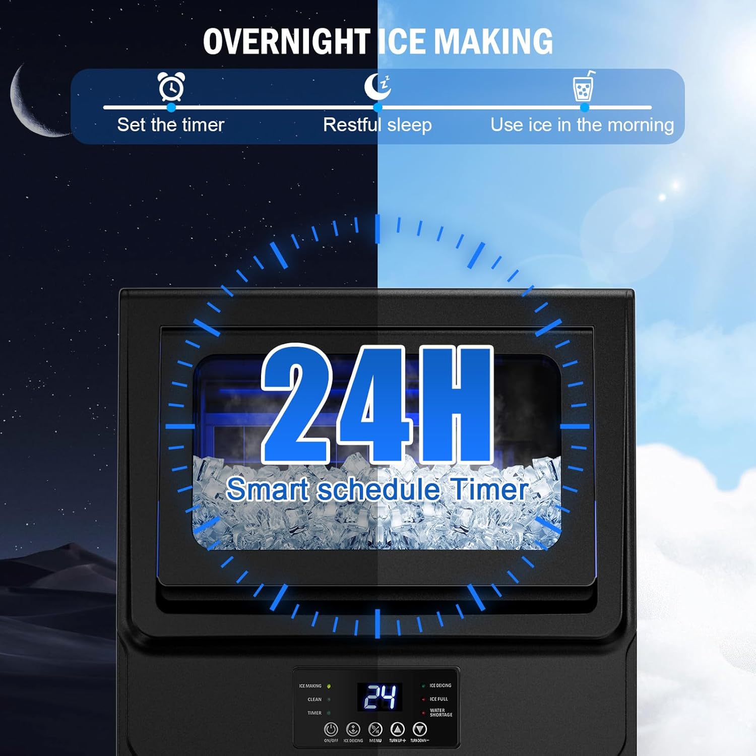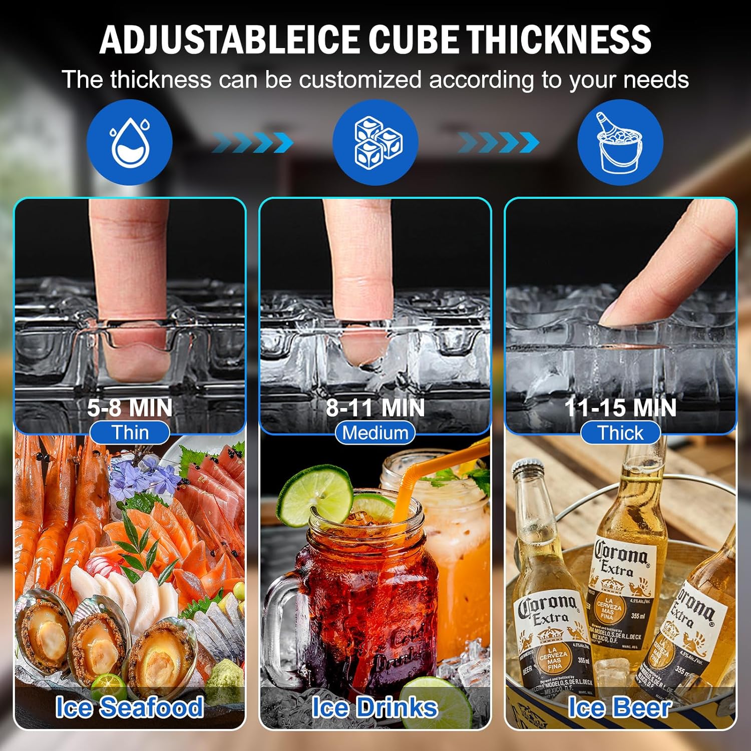 - SMART OPERATION & INDICATOR LIGHTS: This undercounter ice maker machine features a user-friendly control panel with a clear LCD. The under counter ice machine offers multiple functions, including adjustable ice thickness, timer settings, one-touch auto cleaning, and indicator light alerts. The top lid is designed with a sliding mechanism for easy access.