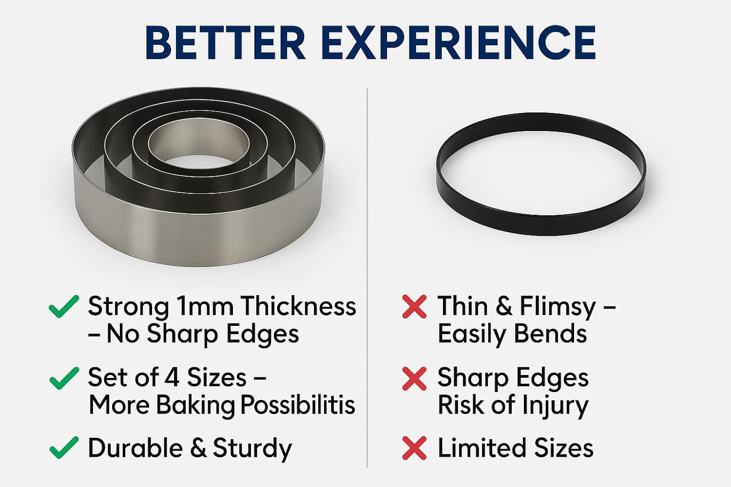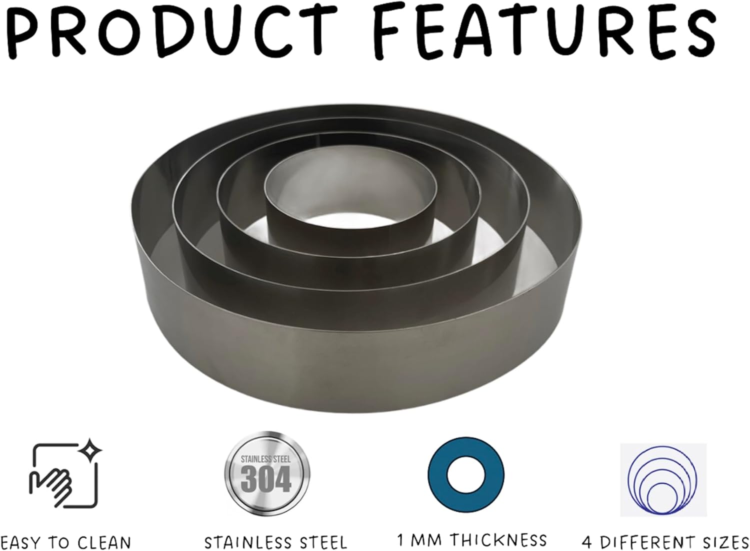 - ▶ PREMIUM STAINLESS STEEL – STRONG & DURABLE! Crafted from 1mm thick stainless steel, these cake rings resist bending, rusting, and warping. Designed for long-lasting use, they provide sturdy and clean cuts The smooth, seamless edges make them safe and easy to handle.