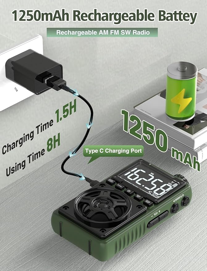• 【1250 Rechargeable Battery&Flashlight】The rechargable shortwave radio comes with a durable built-in 1250mAh rechargeable battery,you can enjoy up to 10-12 hours of music and news on a single charge(using type-c), without the hassle of replacing batteries. Whether you're at the beach, camping, or just enjoying a picnic in the park, you can take this walkman radio with you.The rechargable AM FM radio also comes with a flashlight that allows you to illuminate the environment in case of an emergency.