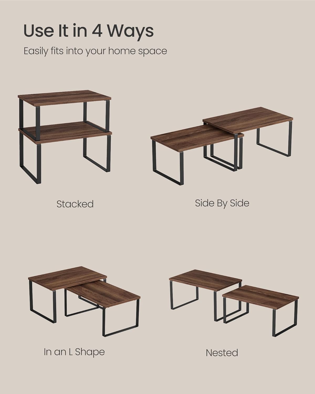 - [Adjustable] With their unique design, with one slightly smaller than the other, these shelf organizers can be stacked on top of one another, nested, used separately, or even in an L-shape. Adjust them how you want to perfectly fit your kitchen space