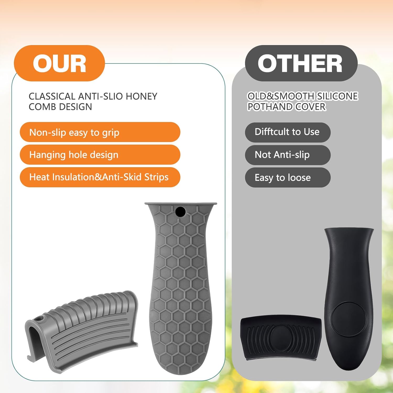 - Anti-slip design: these hot resistant pot sleeve grip handle holders feature honeycomb pattern design on the outside and concave-convex design on the inside to make the handle holder grip stronger and less slippery; The silicone hot skillet handle cover has a handy hanging hole if you prefer to store on a hook, making cooking, baking, etc. in your kitchen easier and fun