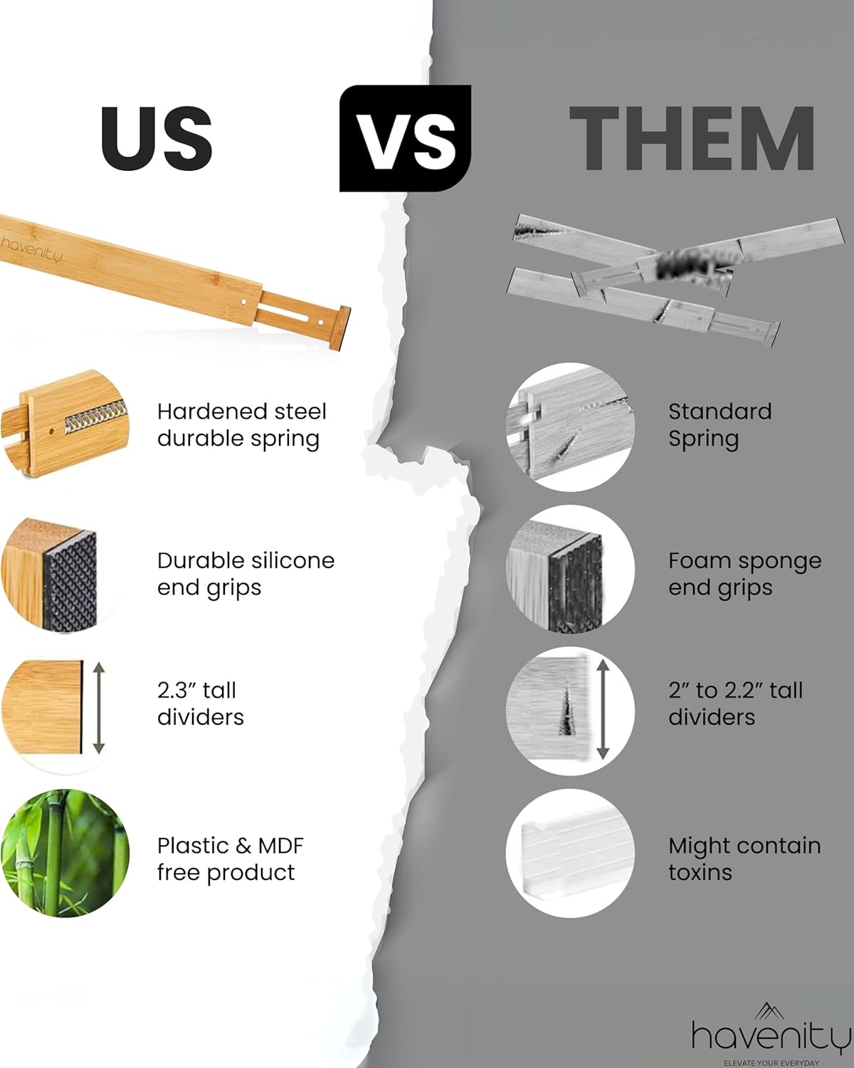 - EXPANDABLE ORGANIZATION: Our adjustable drawer dividers expand from 17" to 22"; You can be installed in your kitchen, bedroom, office drawers, baby's room, desk and bathroom. Our bamboo kitchen drawer dividers are equipped with non-slip pads on both ends, which helps to keep them in place and protect both the drawer and organizer itself.
