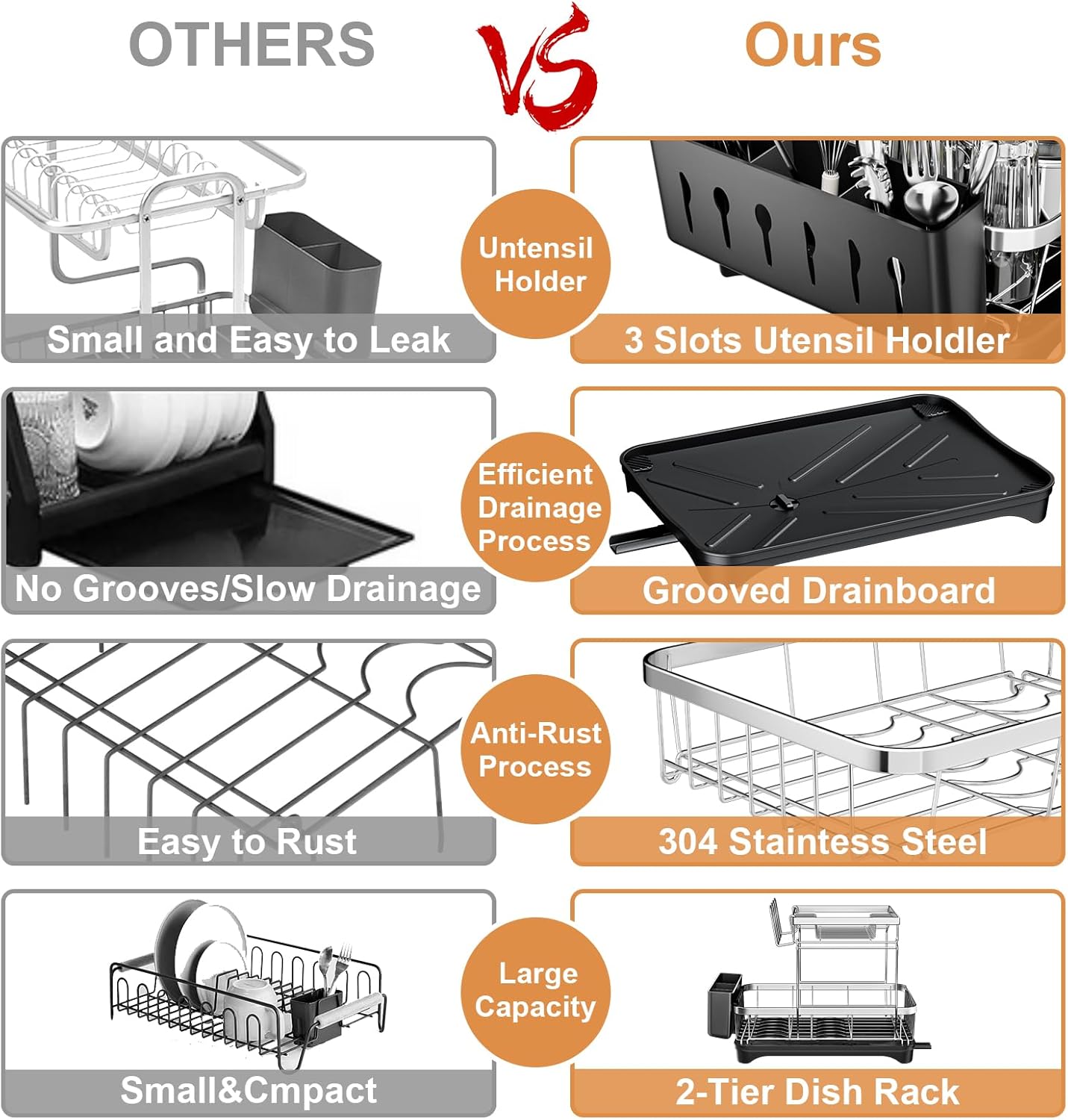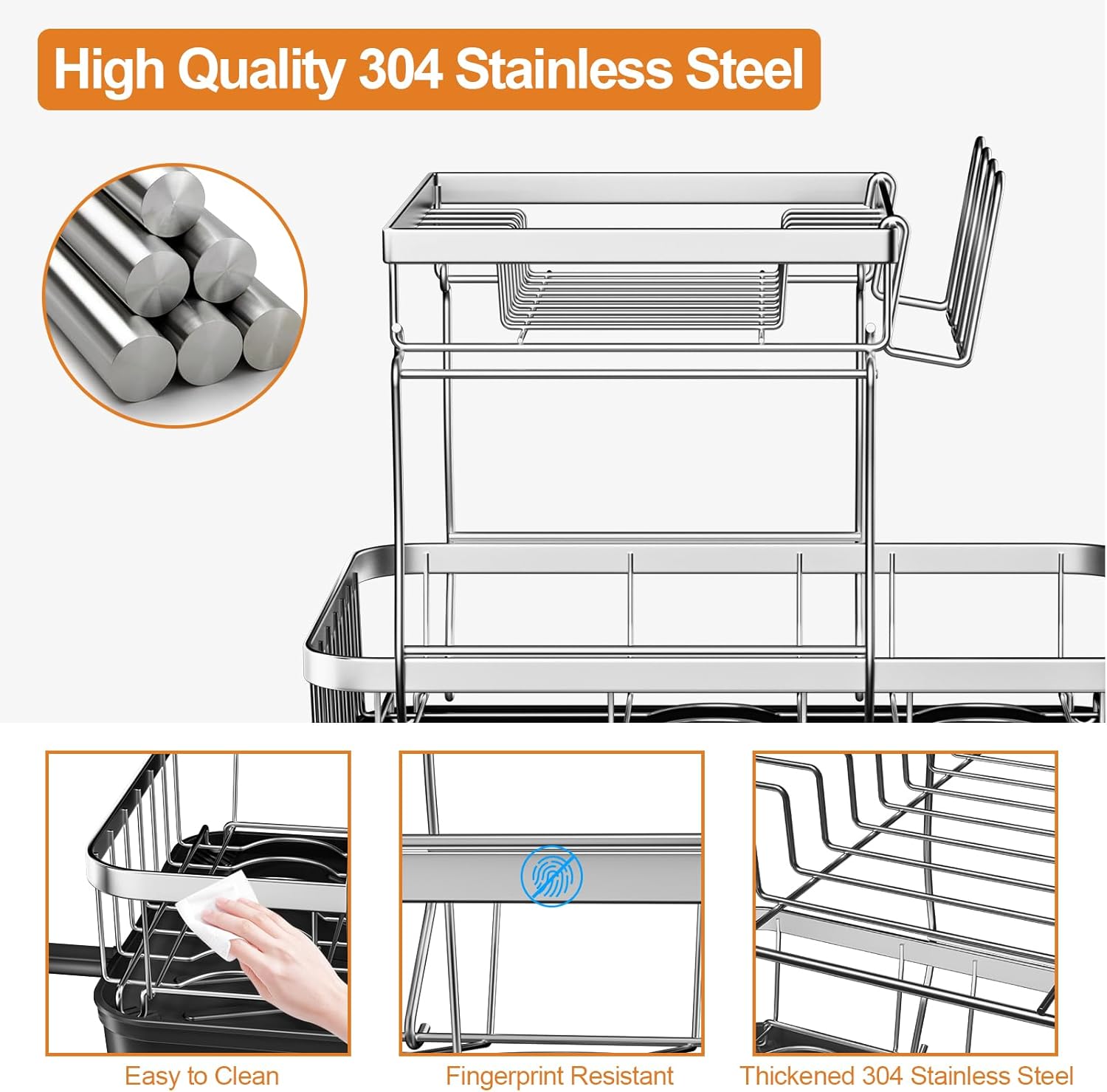 - High Quality & Thoughtful Design: Dish drying rack for kitchen counter is made of 304 stainless steel and is carefully polished to ensure the dish rack with drain is beautiful and high-quality. All corners are rounded and polished to avoid scratches and damage to items