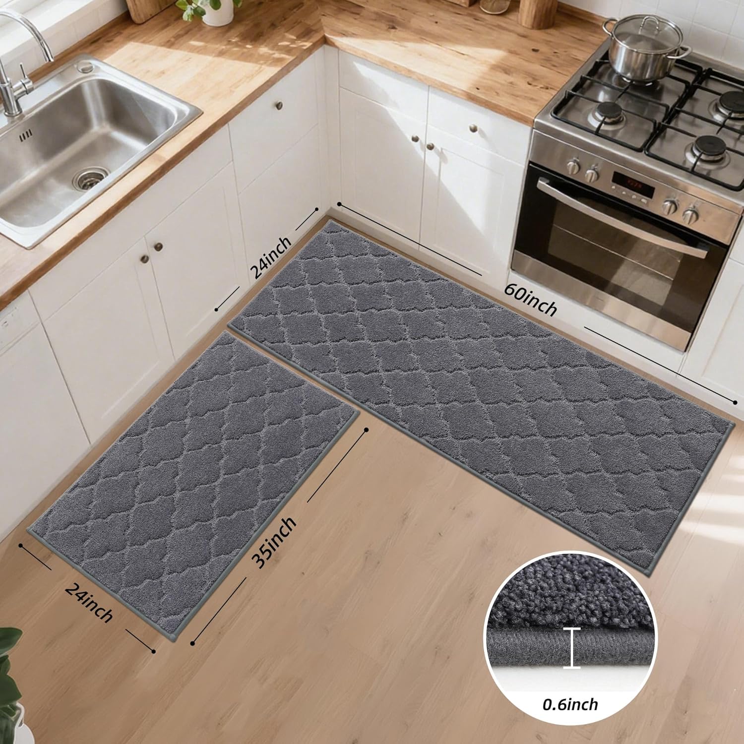 - Unmatched Comfort and Durability: Our kitchen floor mats is made of wear-resisting polyester fibers.The kitchen rugs resists wear through precision stitching for long-term use. Its stain-repellent surface rapidly absorbs spills while blocking oils and food debris, keeping floors dry in high-moisture zones like sinks and cooking stations.