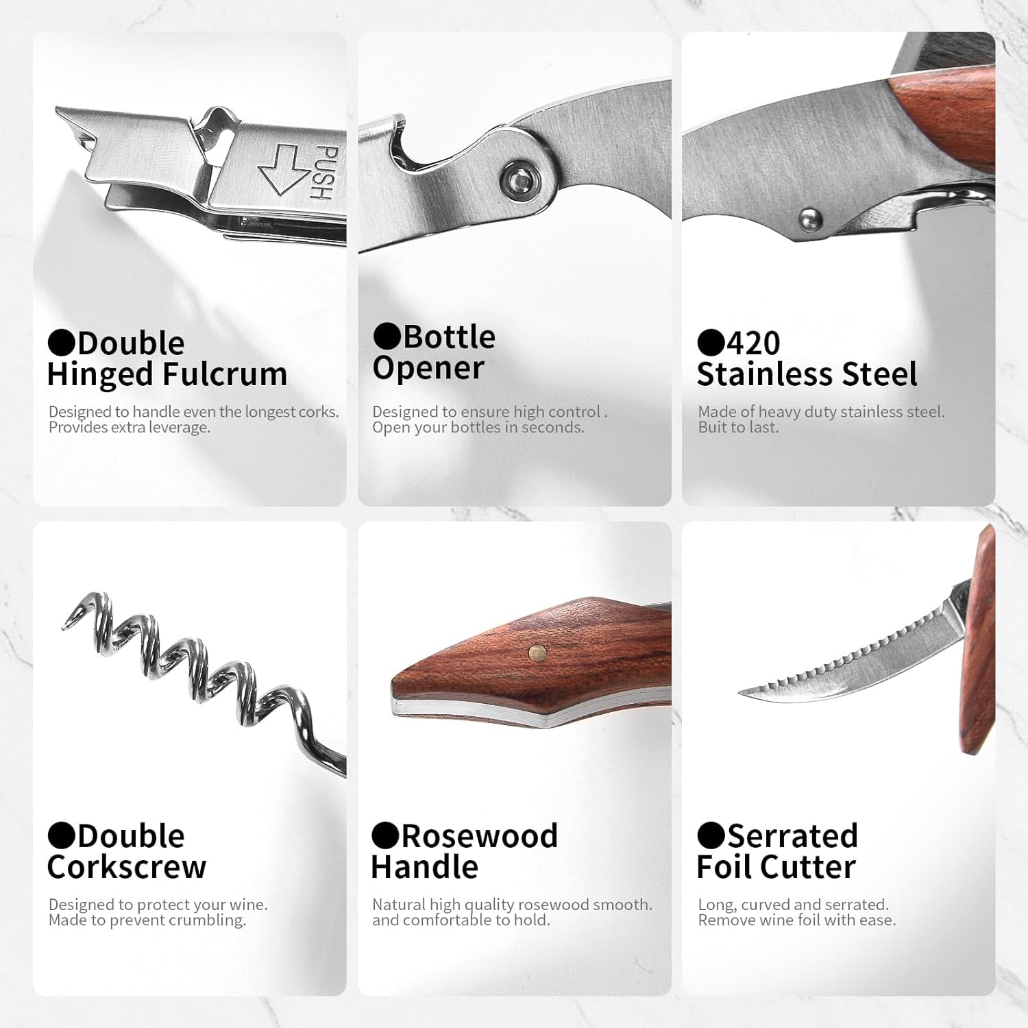 - 【3-1 Multi-functional Design】: This wine bottle opener set has a wine opener, bottle opener, and foil cutter, It is compact and easy to store in wine drawers, kitchen organizers, or your pocket. Due to its diverse functions, ease of use, and customizable features,It's an excellent gift for servers, Bartenders, Waiters, Sommelier, Wine lovers.
