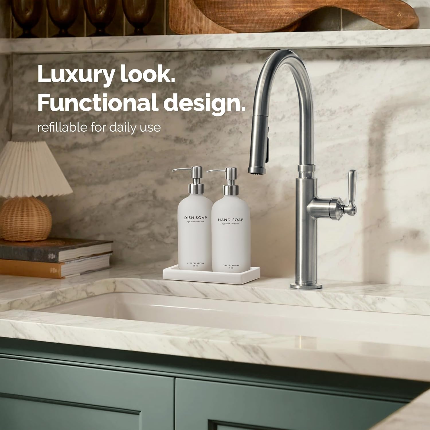 - STYLE YOU CAN FEEL – Heavier than standard dispensers, this hand and dish soap dispenser set of 2 brings substance to your countertop. Built to last and made to impress—with a matching ceramic tray that keeps your set tidy, stylish, and perfectly organized.