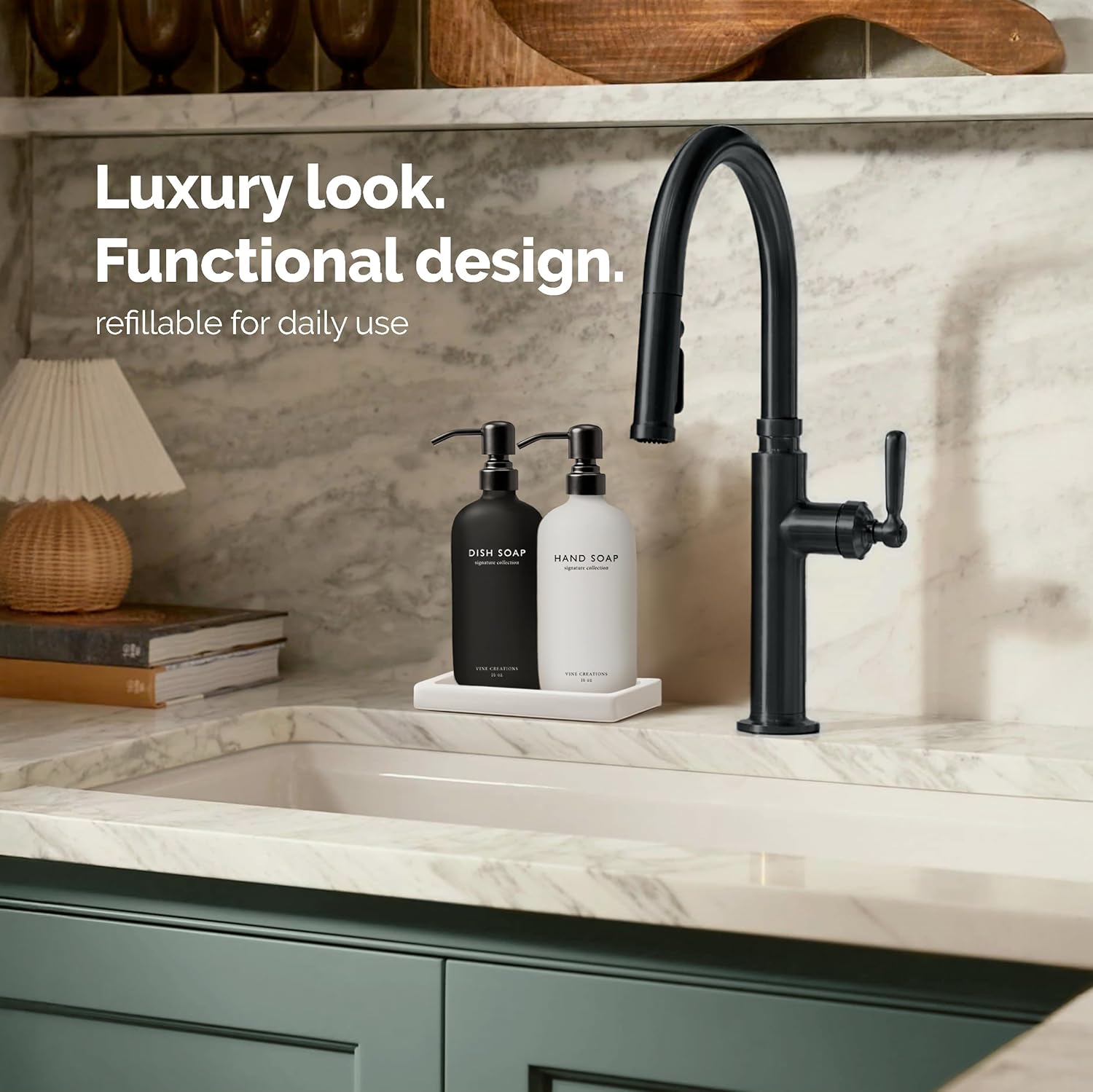 - STYLE YOU CAN FEEL – Heavier than standard dispensers, this hand and dish soap dispenser set of 2 brings substance and sophistication to your countertop. Built to last and made to impress—with a matching ceramic tray that keeps your set tidy, stylish, and perfectly organized.