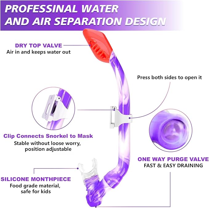 • 【Thickened Tempered Glass Lens】- The Diving Goggles are made of 4.0mm HD tempered glass lens, which is much more thicker and durable than other 3.2mm lens. It is impact resistant and explosion-proof, clear and safe. Dry-top snorkels have a mechanism that prevents water from entering the tube when submerged, making them a good choice for beginners