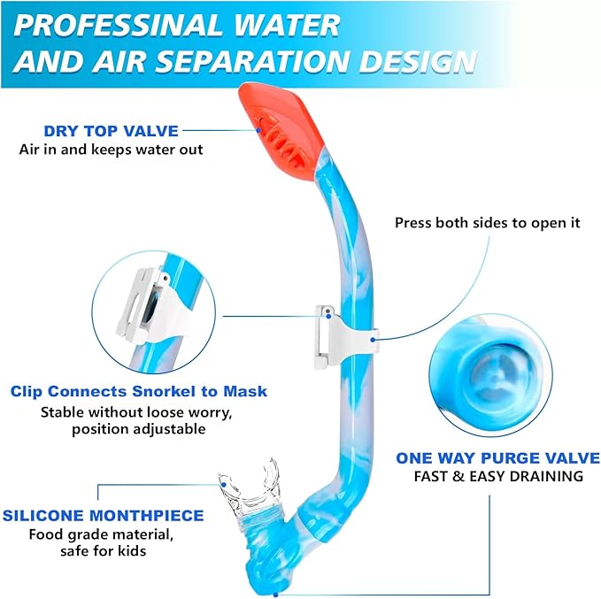 • 【Thickened Tempered Glass Lens】- The Diving Goggles are made of 4.0mm HD tempered glass lens, which is much more thicker and durable than other 3.2mm lens. It is impact resistant and explosion-proof, clear and safe. Dry-top snorkels have a mechanism that prevents water from entering the tube when submerged, making them a good choice for beginners
