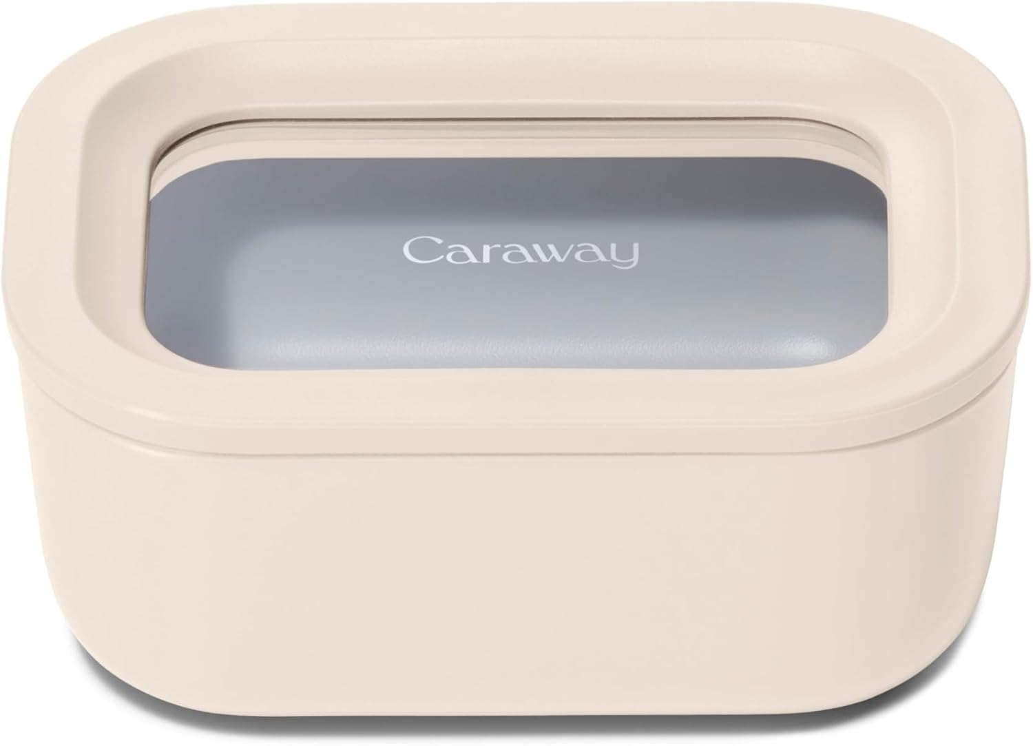 Caraway Mini Rectangle Food Storage Container - 2.6 Cup Glass Storage Container for Food - Non-Toxic Ceramic-Coated Glass - Air Release Technology - Compact & Stackable Design - Cream