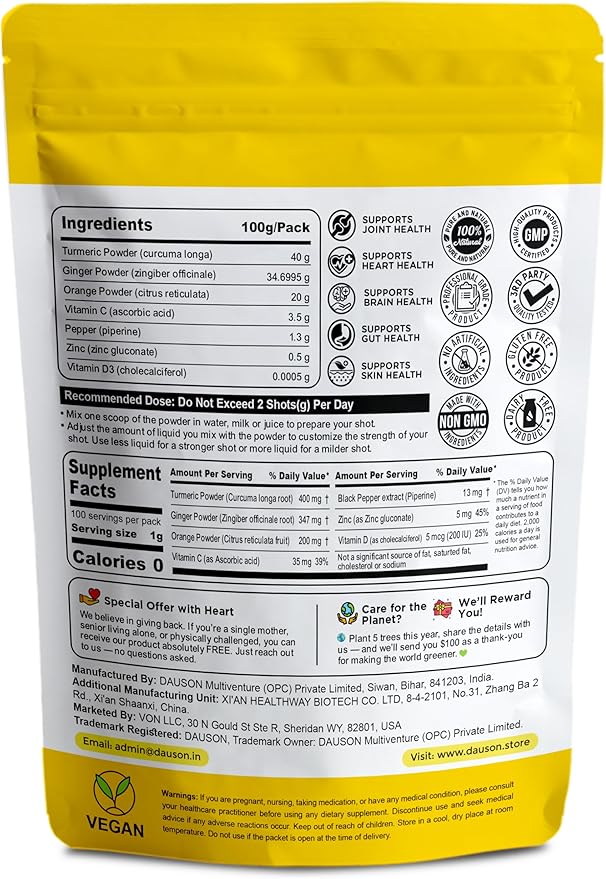 Turmeric Ginger Supplements with Piperine, Vitamin C, Vitamin D3 & Zinc | Turmeric Ginger Shots for Joint, Heart, Brain, Gut & Skin Health | 100 Servings | Ayurvedic | Powder