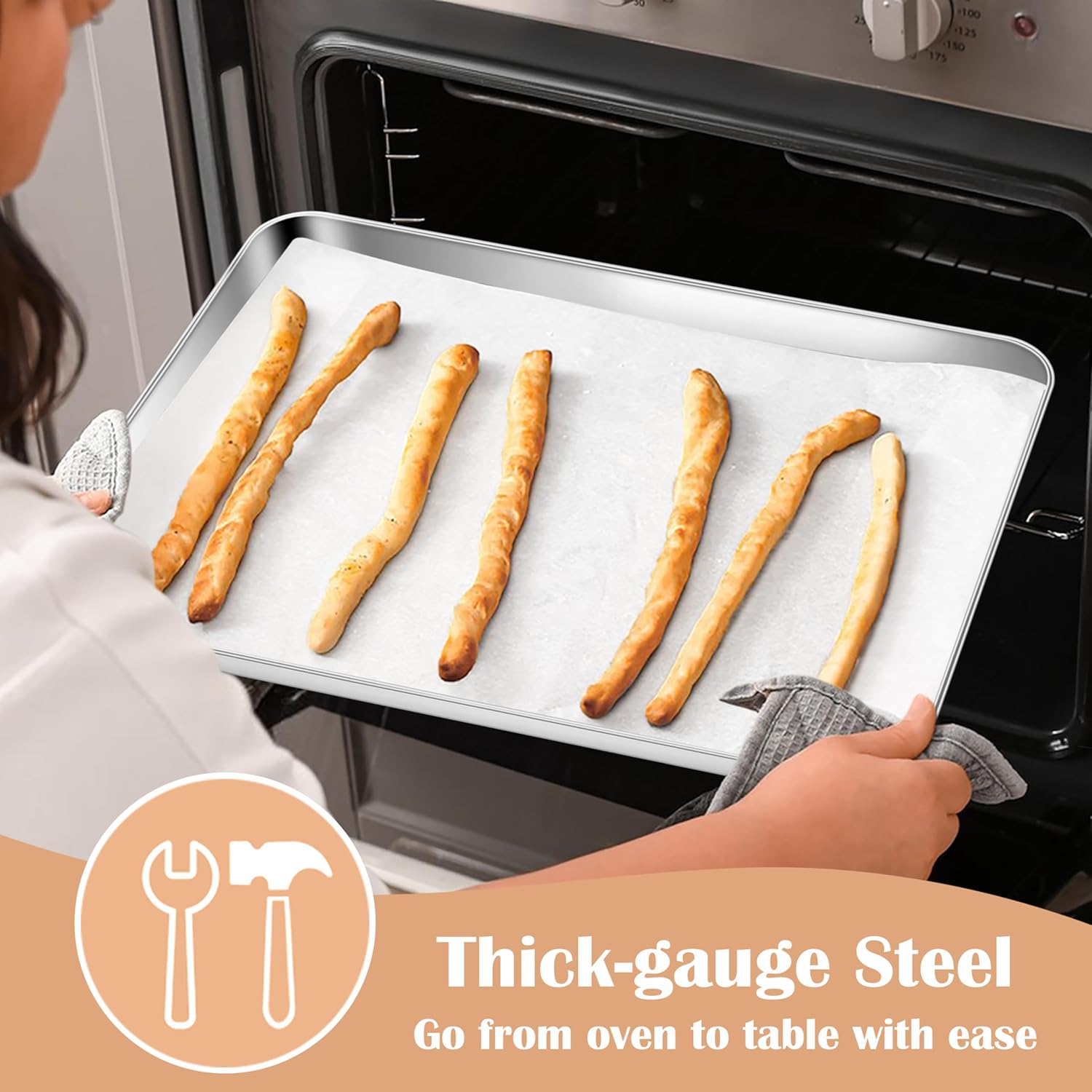 - BAKING EVENLY: Pure stainless steel provides excellent heat conductivity for perfectly browned food, With flat bottom ensures even and uniform baking for good baking performance, Make it ideal for baking cookies/bacon/chicken or cooking large meals